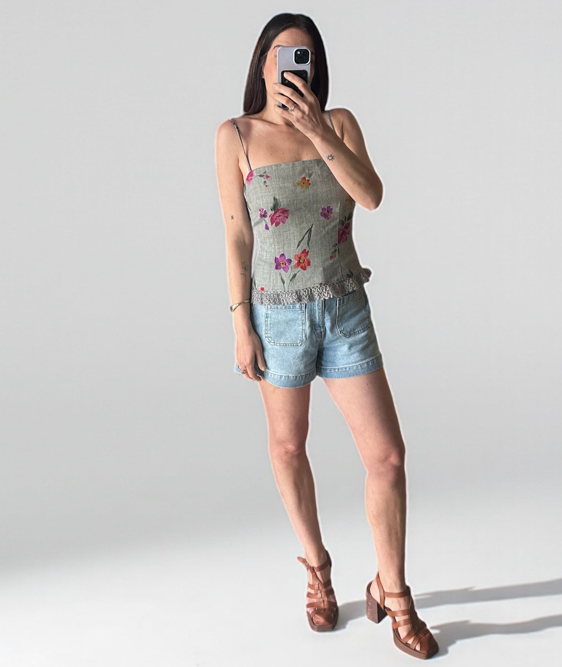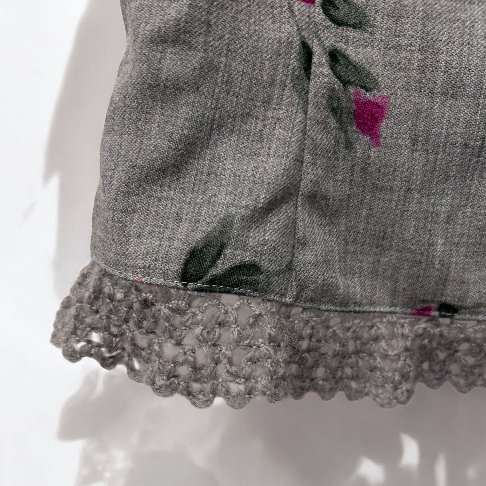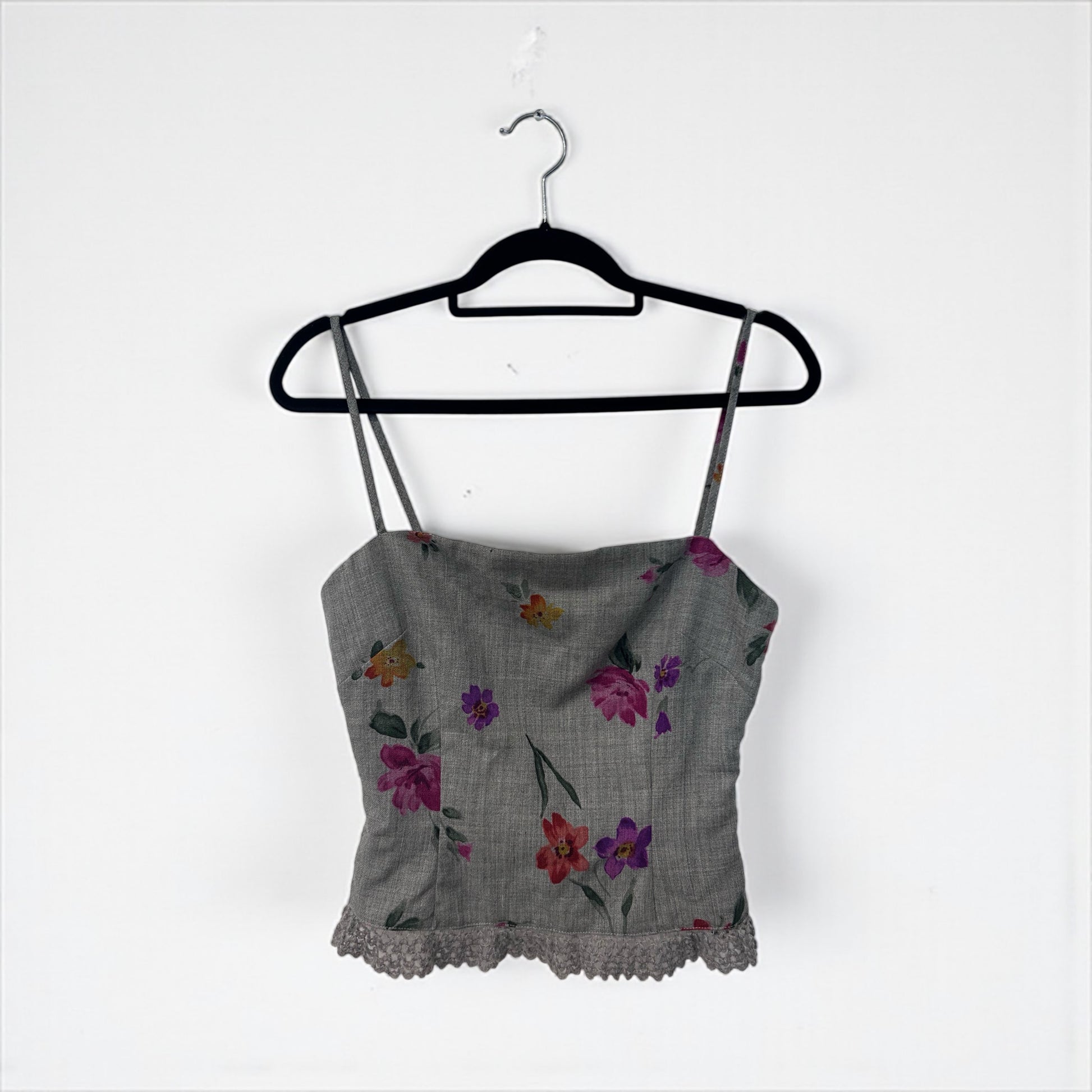 הטופ עשוי בד אפור בהיר עם הדפס פרחים בגווני ורוד, סגול וכתום.