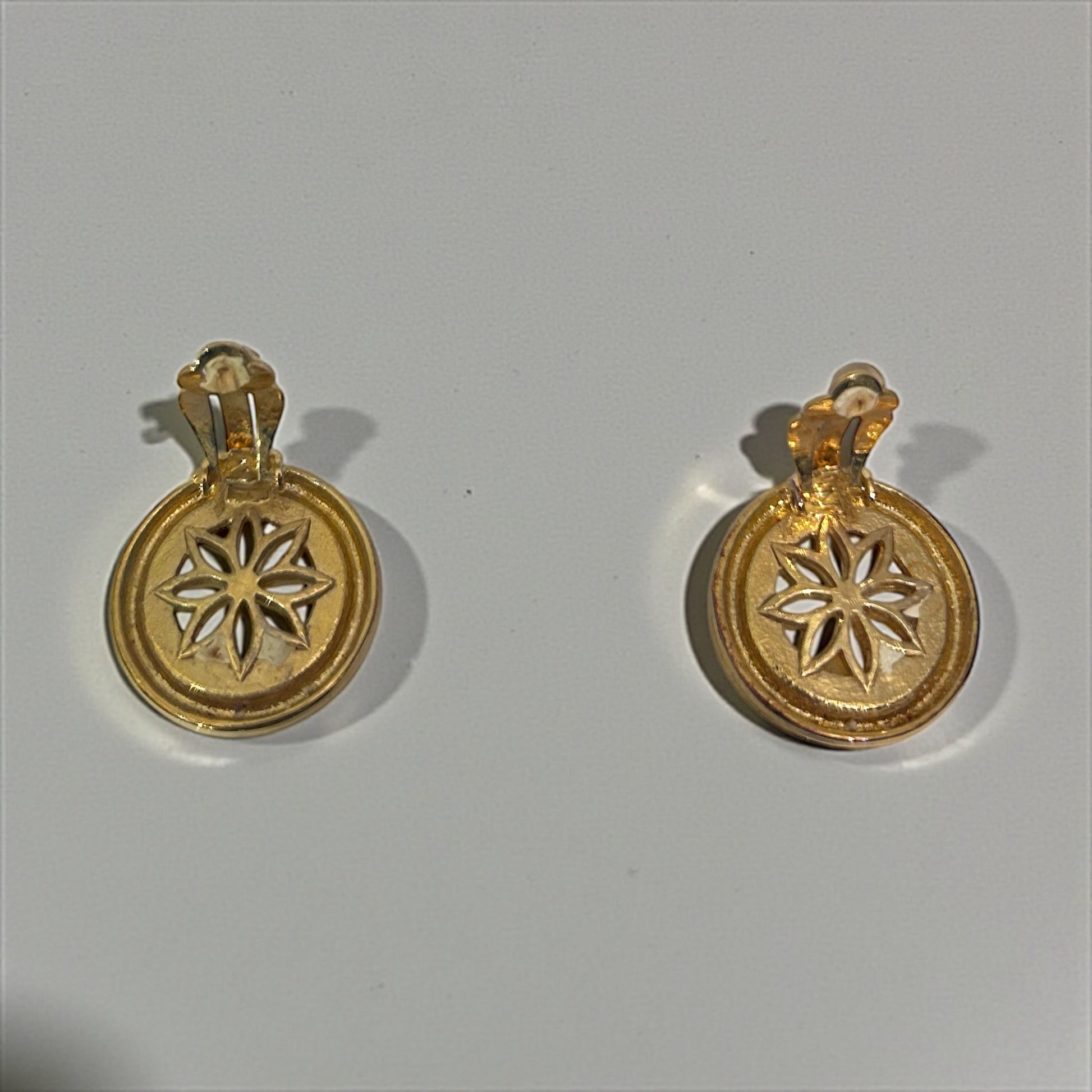 עגילי וינטג׳ קלאסיים מבית Nina Ricci Paris, בעיצוב עגול ומעודן, המעוטר בלוגו החרוט של המותג סביב פנינה לבנה