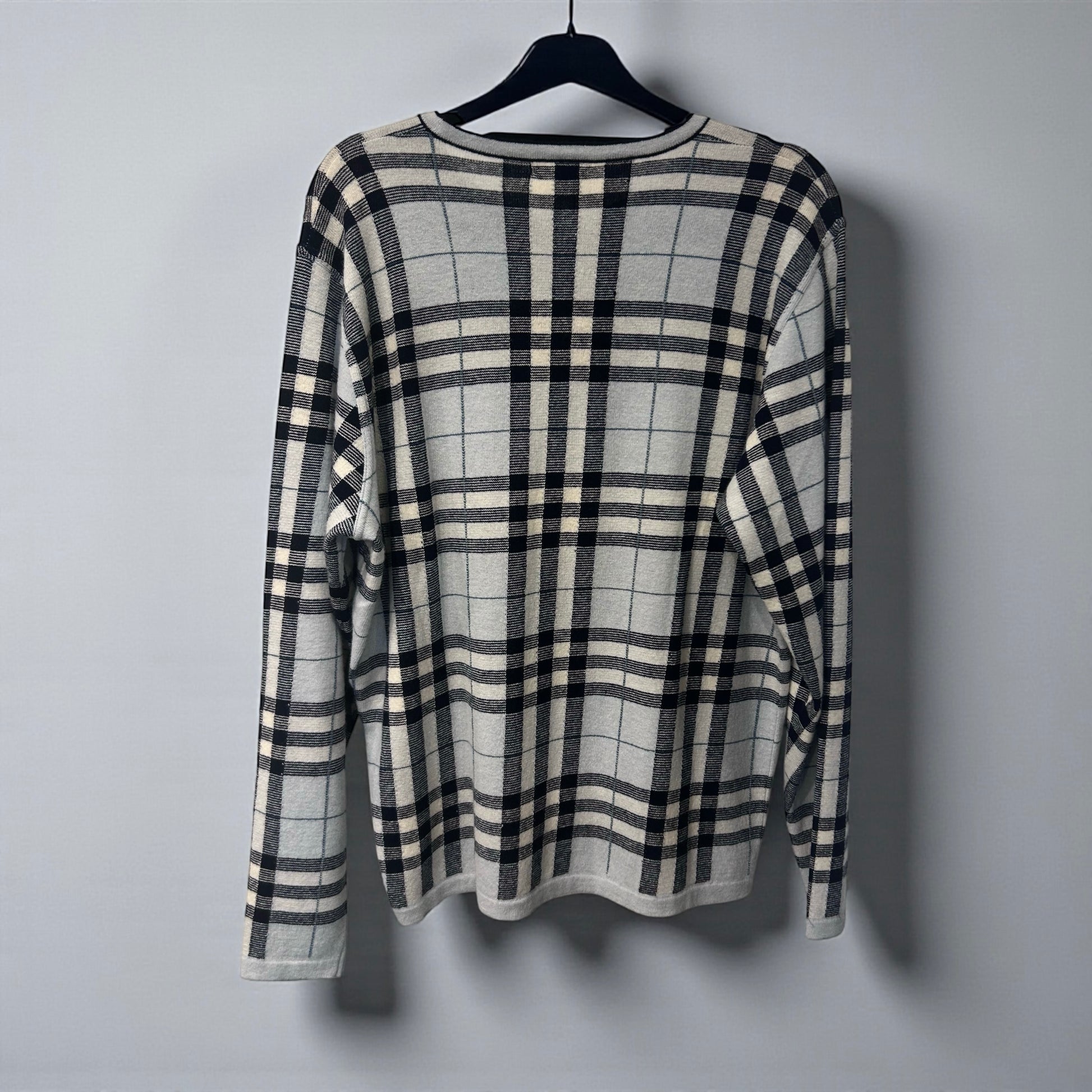 הסוודר עשוי צמר מרינו רך ונעים בהדפס המשבצות המזוהה עם המותג