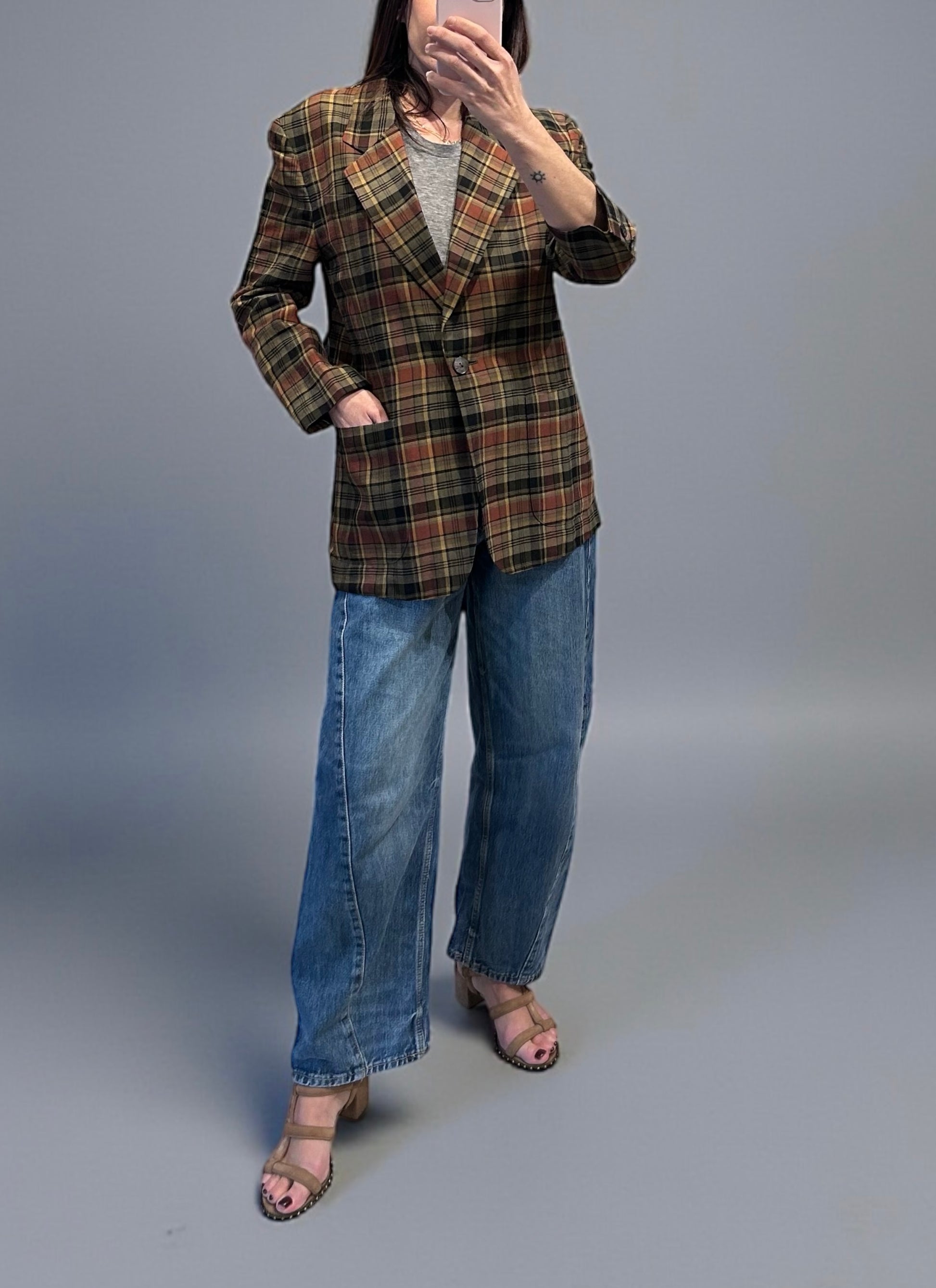 הדוגמה המשובצת בגווני חום, ירוק, כתום וחרדל מעניקה מראה חם ואלגנטי, עם גזרה מחויטת אך קלילה.