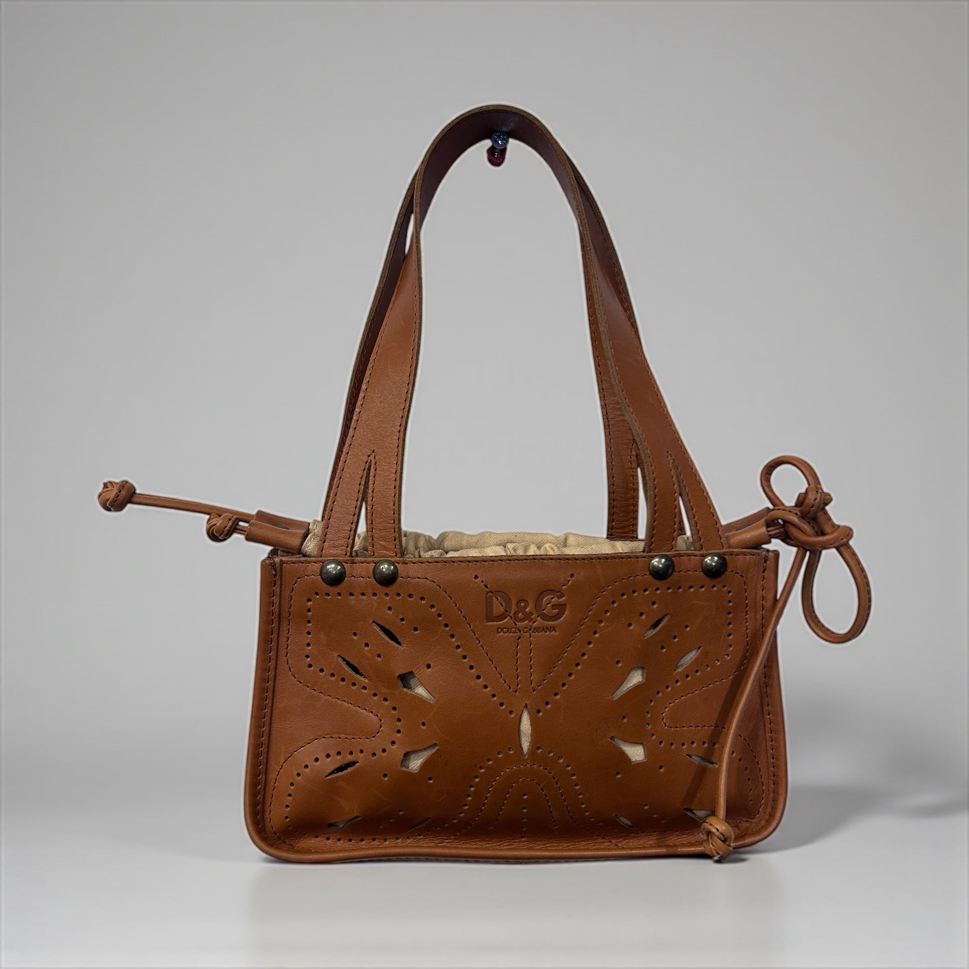 תיק וינטג’ נדיר מבית האופנה האיטלקי Dolce & Gabbana מתחילת שנות ה־2000. עשוי עור חום רך עם עבודת חיתוכי לייזר אומנותית היוצרת מראה של פרפר בחזית