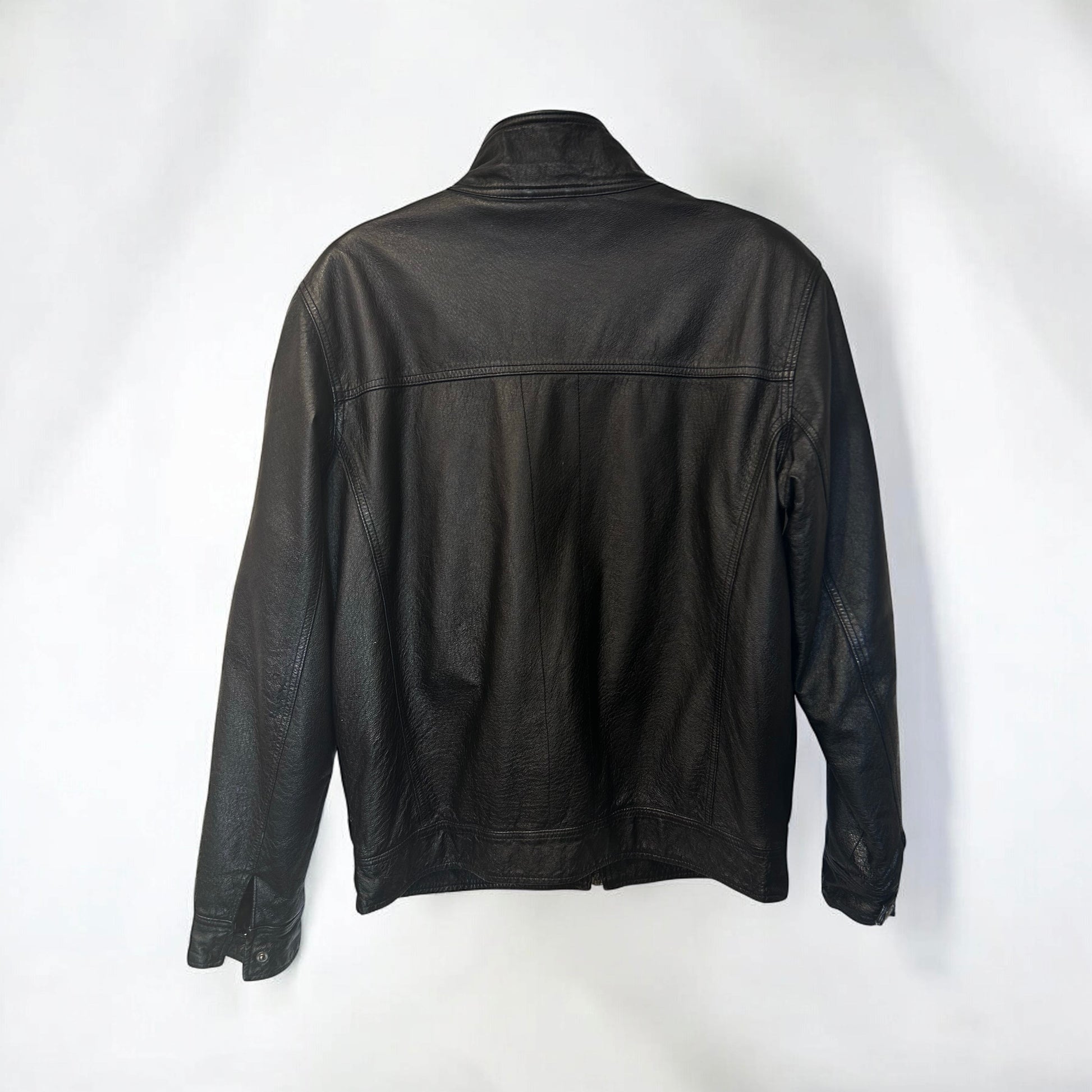 עשוי עור שחור בגימור טבעי ורך, עם גזרה מעט בומברית וסגירת רוכסן מלאה בחזית.