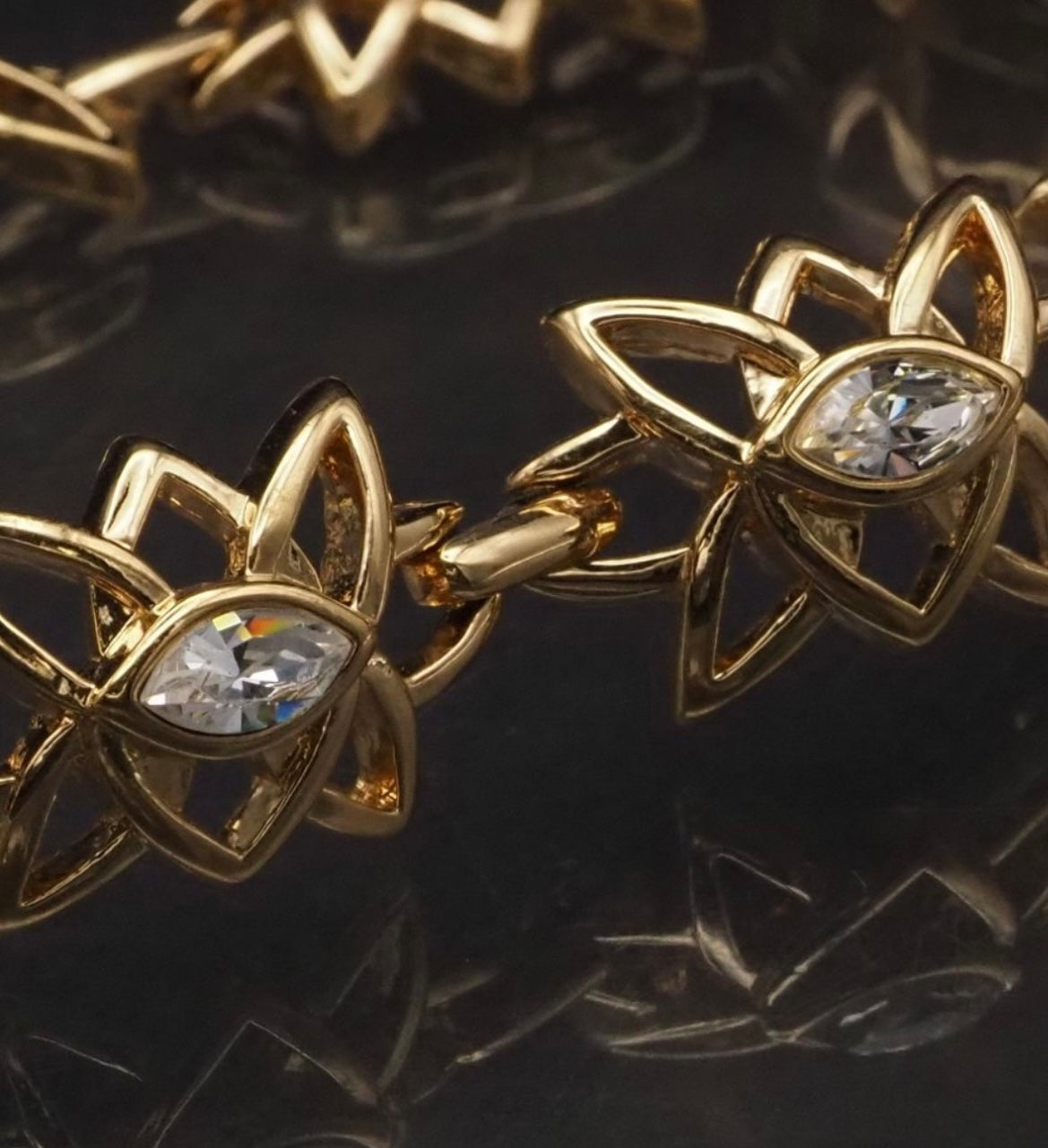 השרשרת עשויה ציפוי זהב 18 קראט איכותי מאוד, ומורכבת מחוליות פרחוניות תלת־ממדיות, כאשר כל פרח משובץ קריסטל סברובסקי שקוף בחיתוך מרקיזה, המעניק ברק אלגנטי ועשיר.