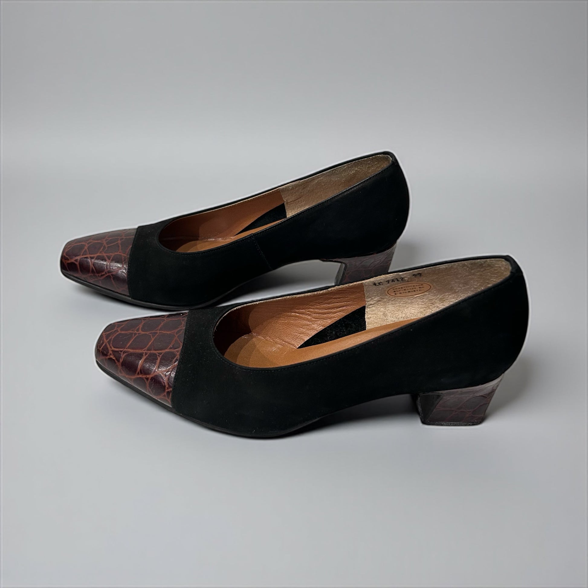 הנעליים עשויות זמש שחור בשילוב חרטום ועקבי עור בהטבעת קרוקו בגוון חום-בורדו עמוק.