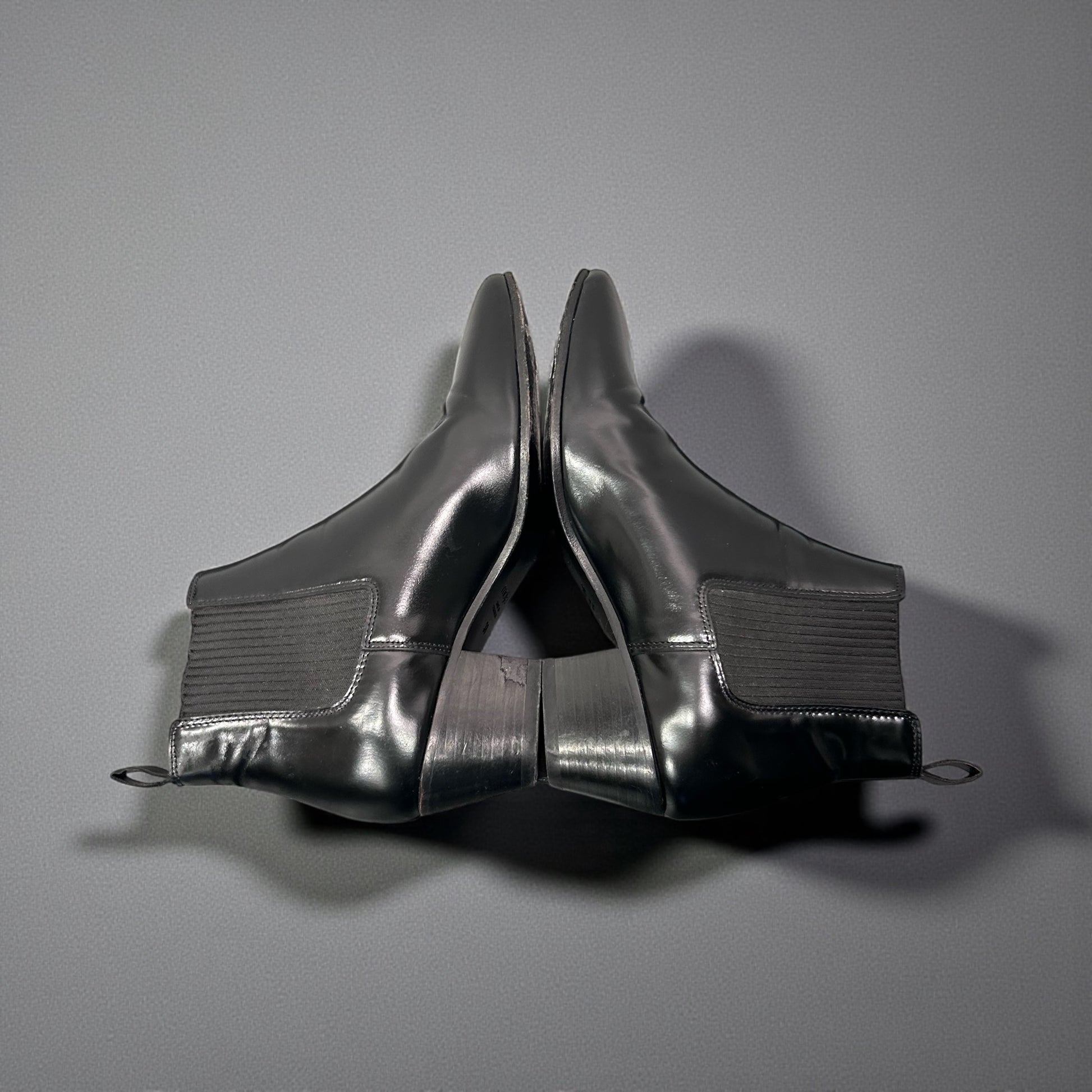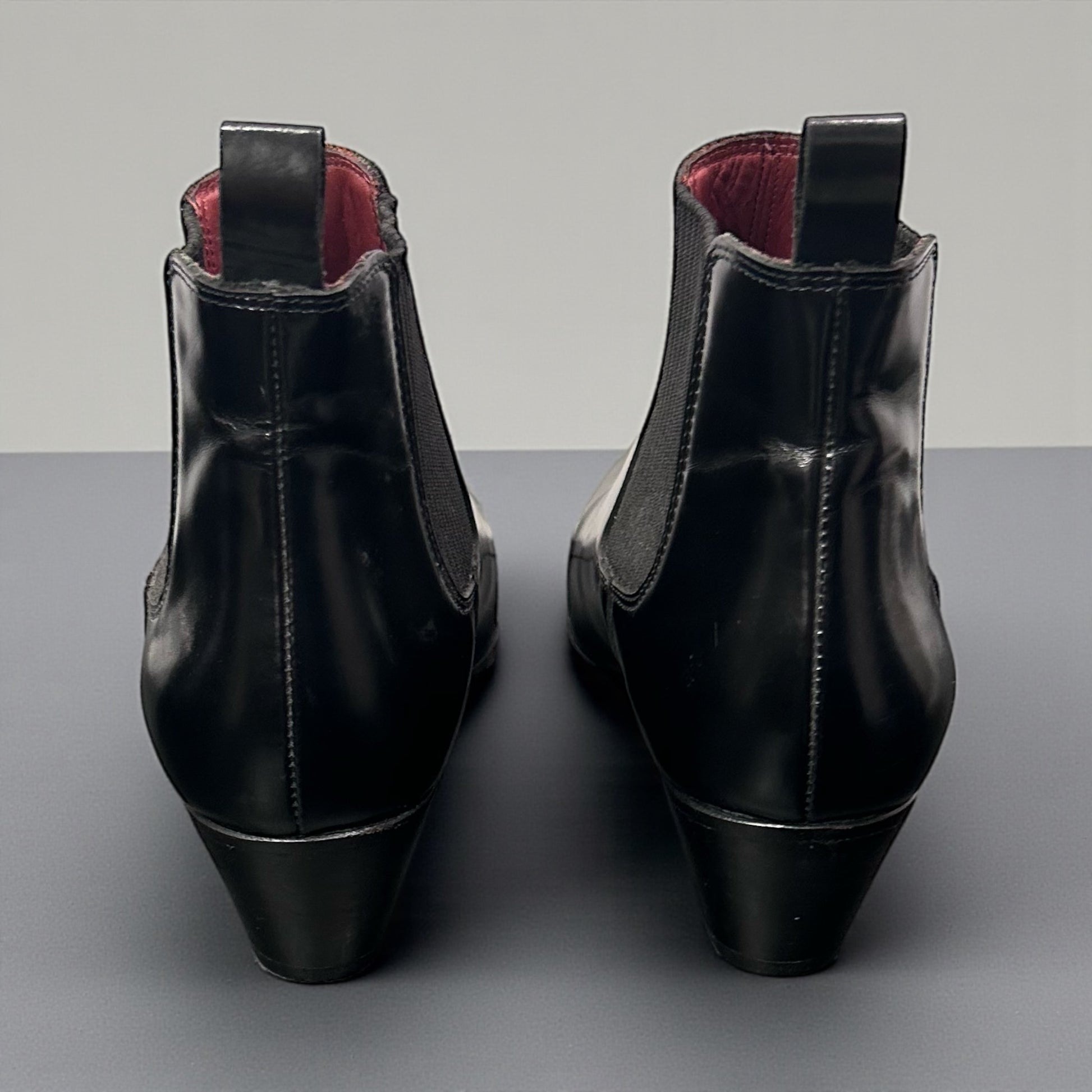 עשויים עור שחור מבריק בגזרה מחודדת ואלגנטית, עם גומי צדדי רחב לנעילה נוחה ולוק מינימליסטי