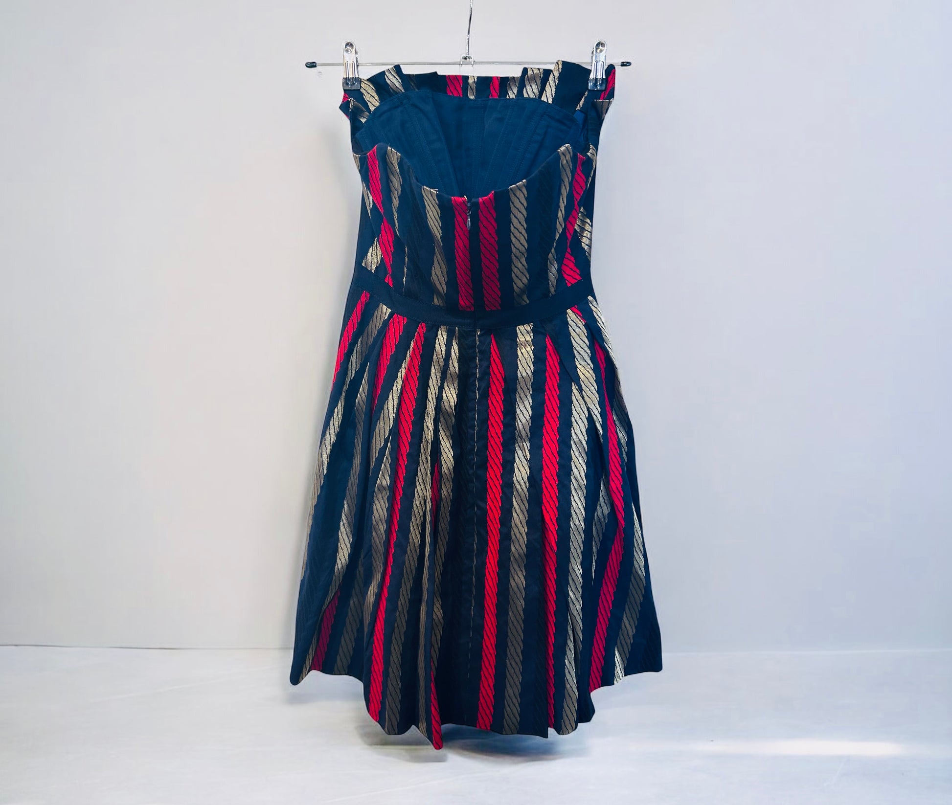 עשויה בד טקסטורלי עשיר עם ברק עדין, בהדפס פסים אלכסוניים בצבעי שחור, אדום וזהב – שילוב שמעניק לשמלה נוכחות ושיק על זמני