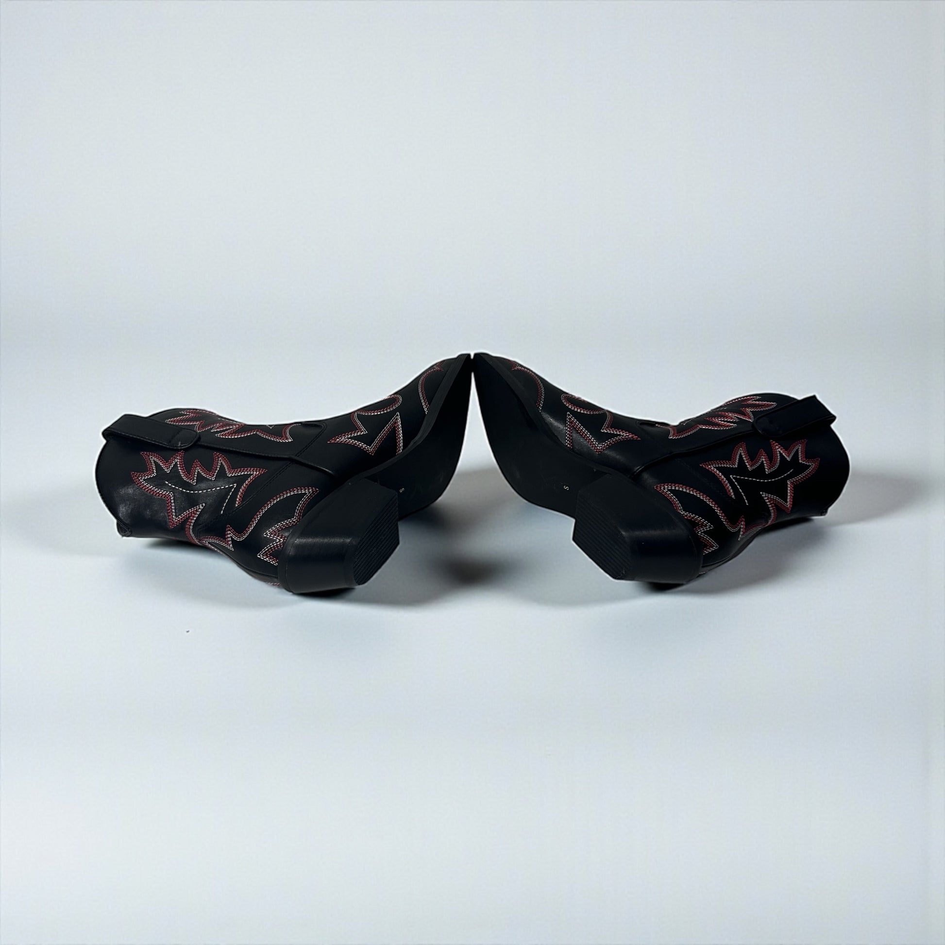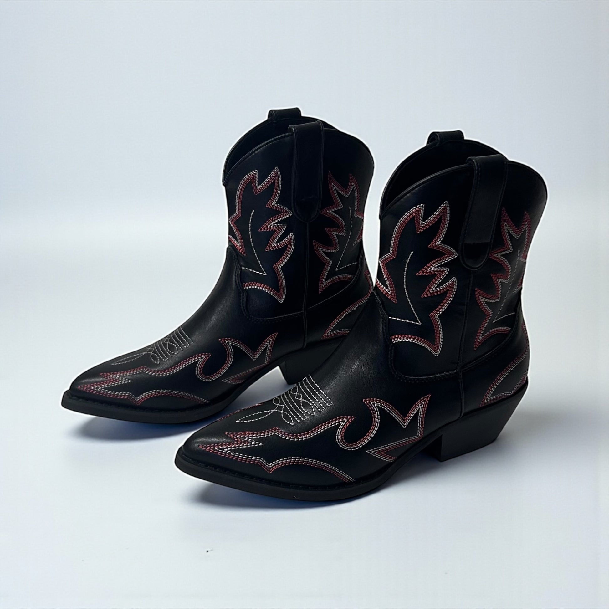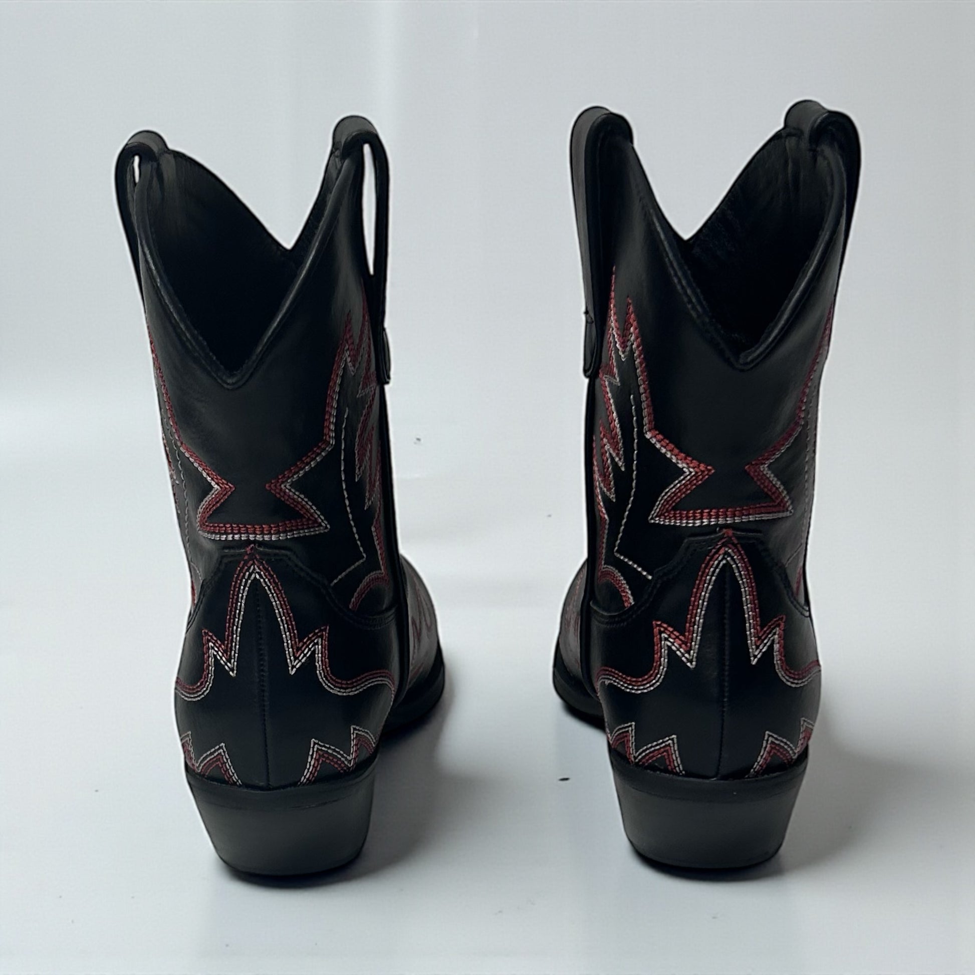 המגפיים עשויים עור שחור איכותי, עם רקמות בוקרים קלאסיות בגווני אדום ולבן היוצרות ניגוד דרמטי וייחודי.