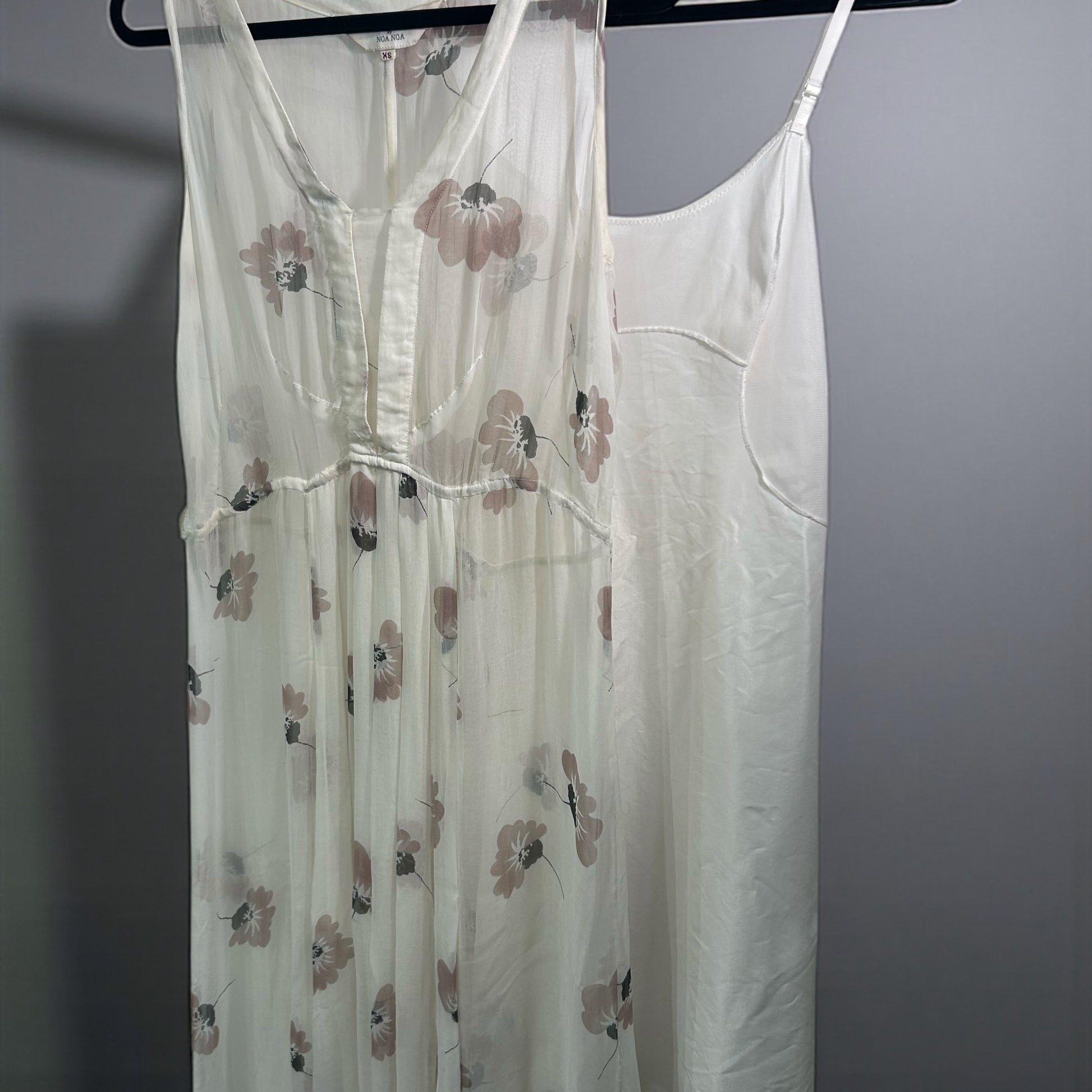 השמלה בעיצוב שקוף ועדין מבד ויסקוזה קליל בצבע שמנת עם הדפס פרחים רכים.