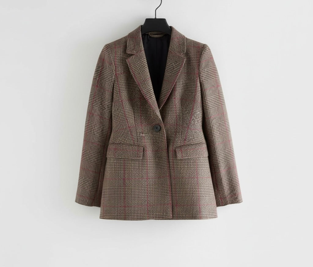 בלייזר קלאסי של המותג השוודי & Other Stories בגזרה מחויטת, עשוי בד משובץ בגווני חום-אפור עם נגיעות קו אדמדם.