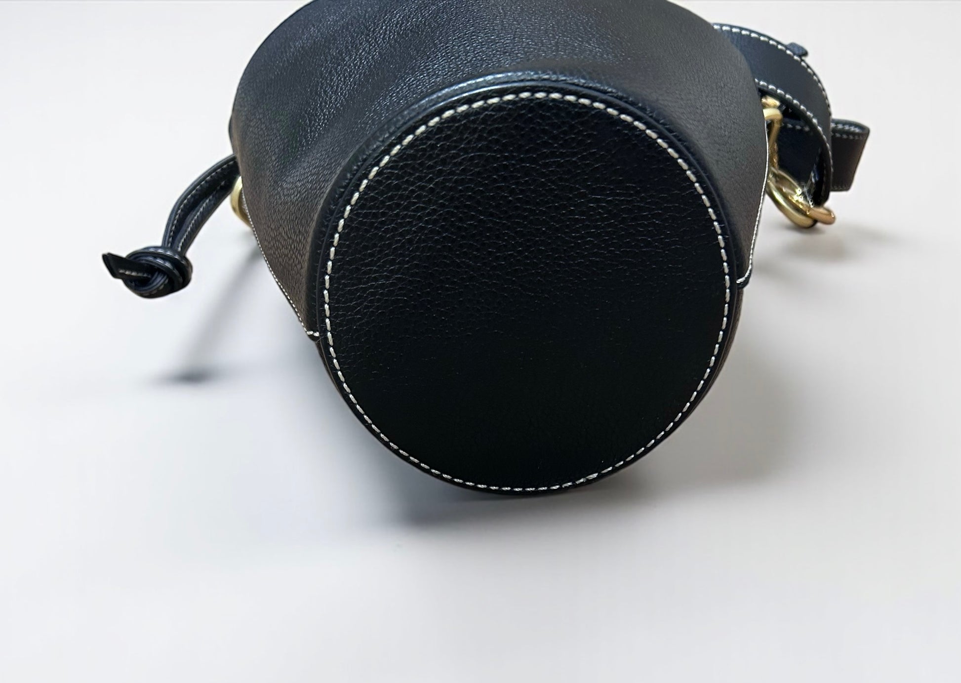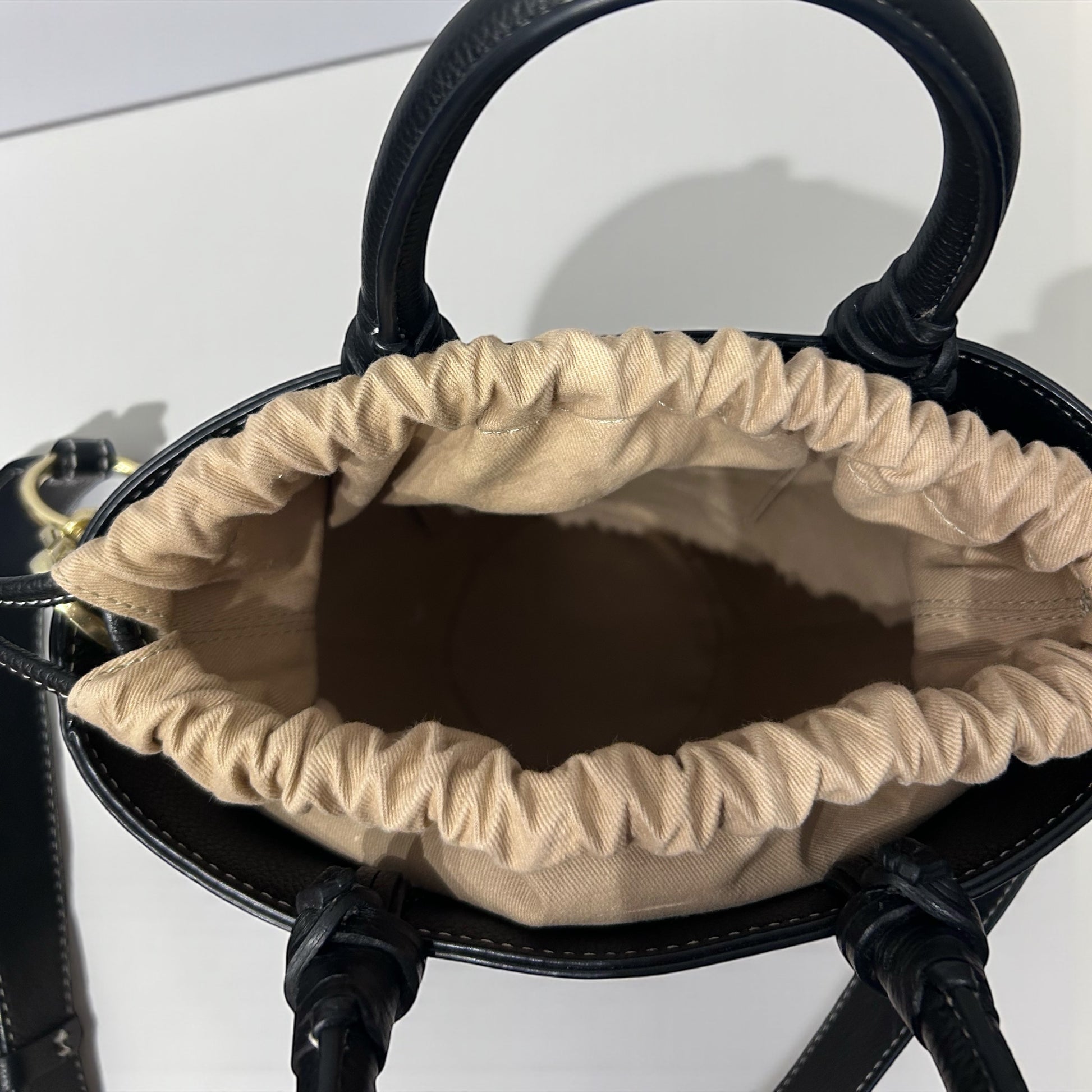 תיק bucket אייקוני של See by Chloé בצבע שחור קלאסי, עשוי עור גרגירי איכותי עם תיפורי קונטרסט עדינים בגוון לבן המדגישים את המבנה הפיסולי הייחודי שלו.