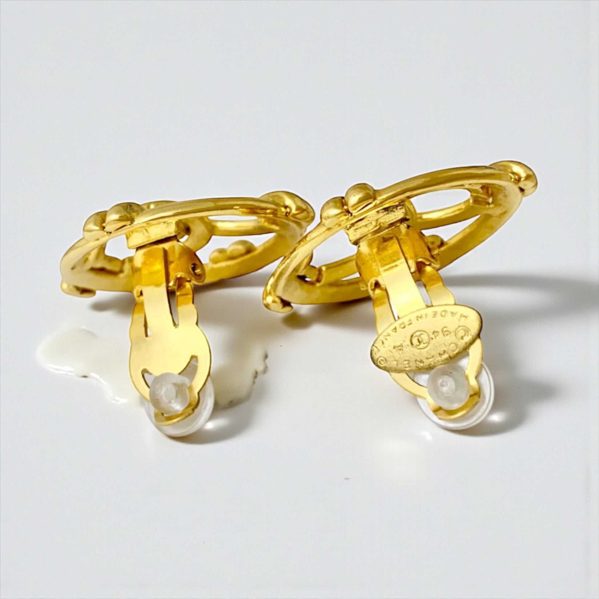 עגילי קליפס וינטג’ איקוניים מבית האופנה CHANEL, מקולקציית אביב 1994, בעיצוב לוגו ה־CC המזוהה של הבית, המשולב בתוך חישוק עגול בגימור זהב אלגנטי.