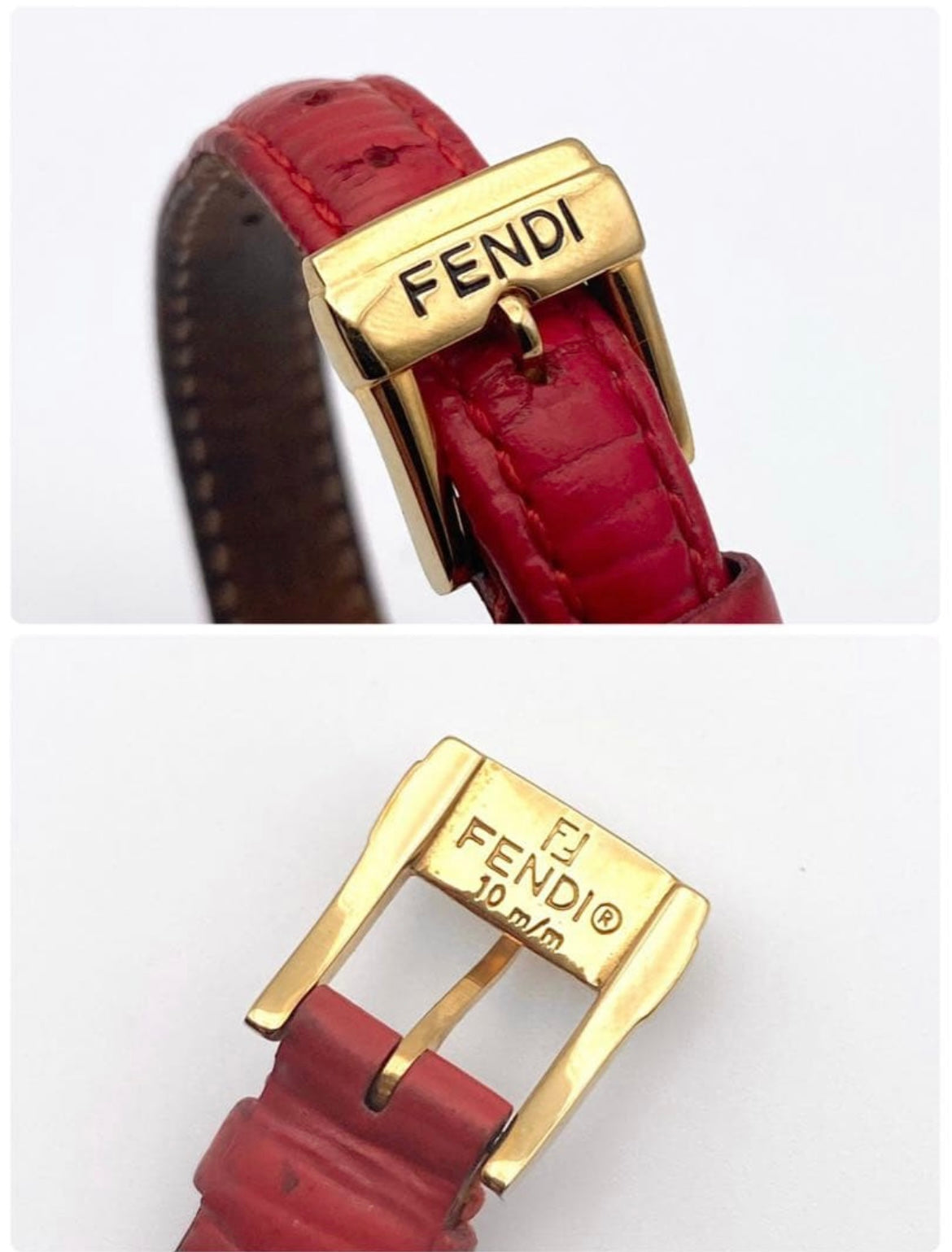 שעון וינטג’ מבית האופנה האיטלקי Fendi, עם גוף עשוי ציפוי זהב ורצועת עור אדומה שמעניקה לו מראה ייחודי .