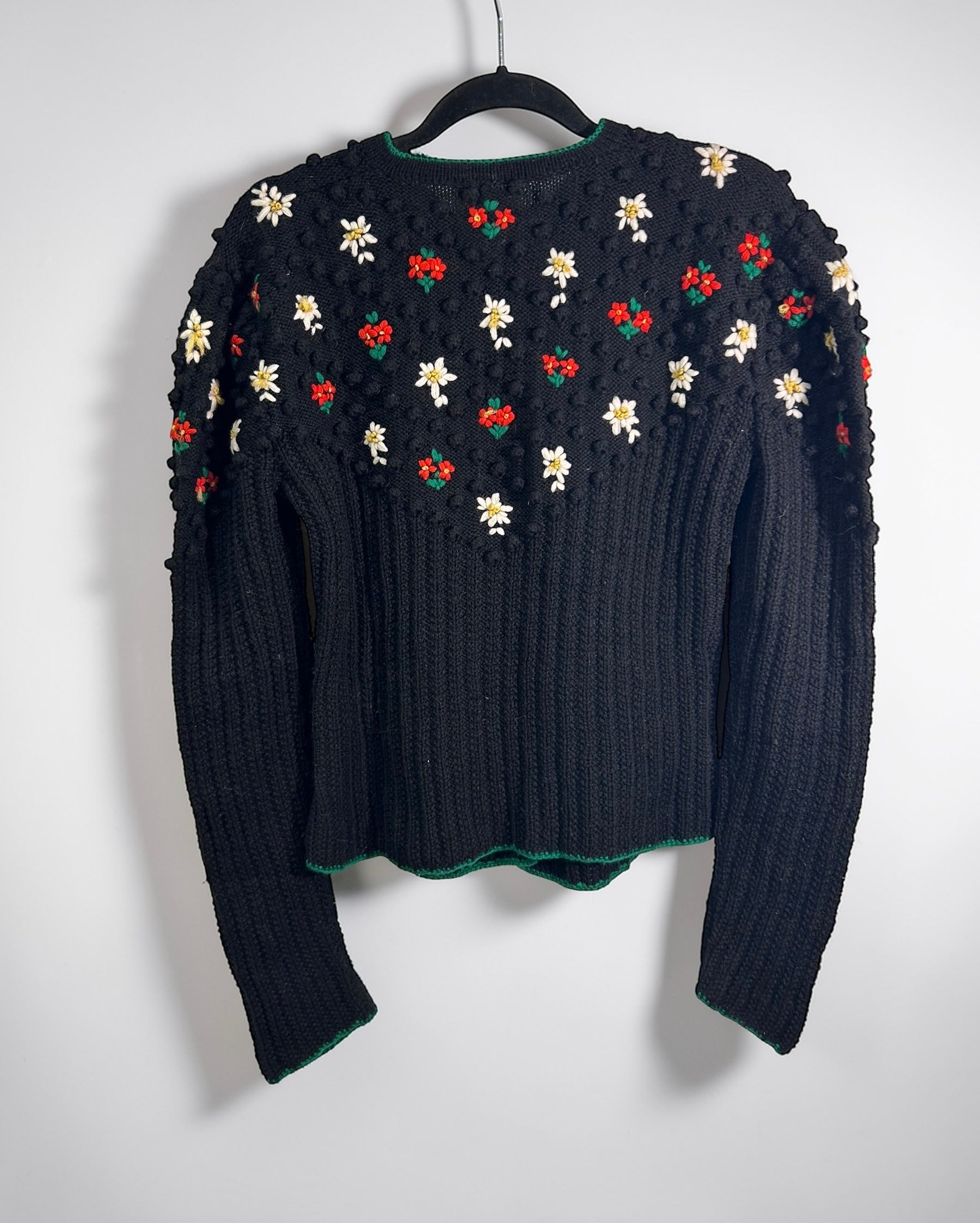 הקרדיגן סרוג בצבע שחור עם עיטור ירוק עדין לאורך הפתיחה והצווארון, ומעוטר ברקמות פרחים צבעוניות הכוללות פרחי אדלוויס לבנים ופרחים אדומים קטנים – מוטיב אלפיני מסורתי המזוהה עם התרבות האוסטרית.