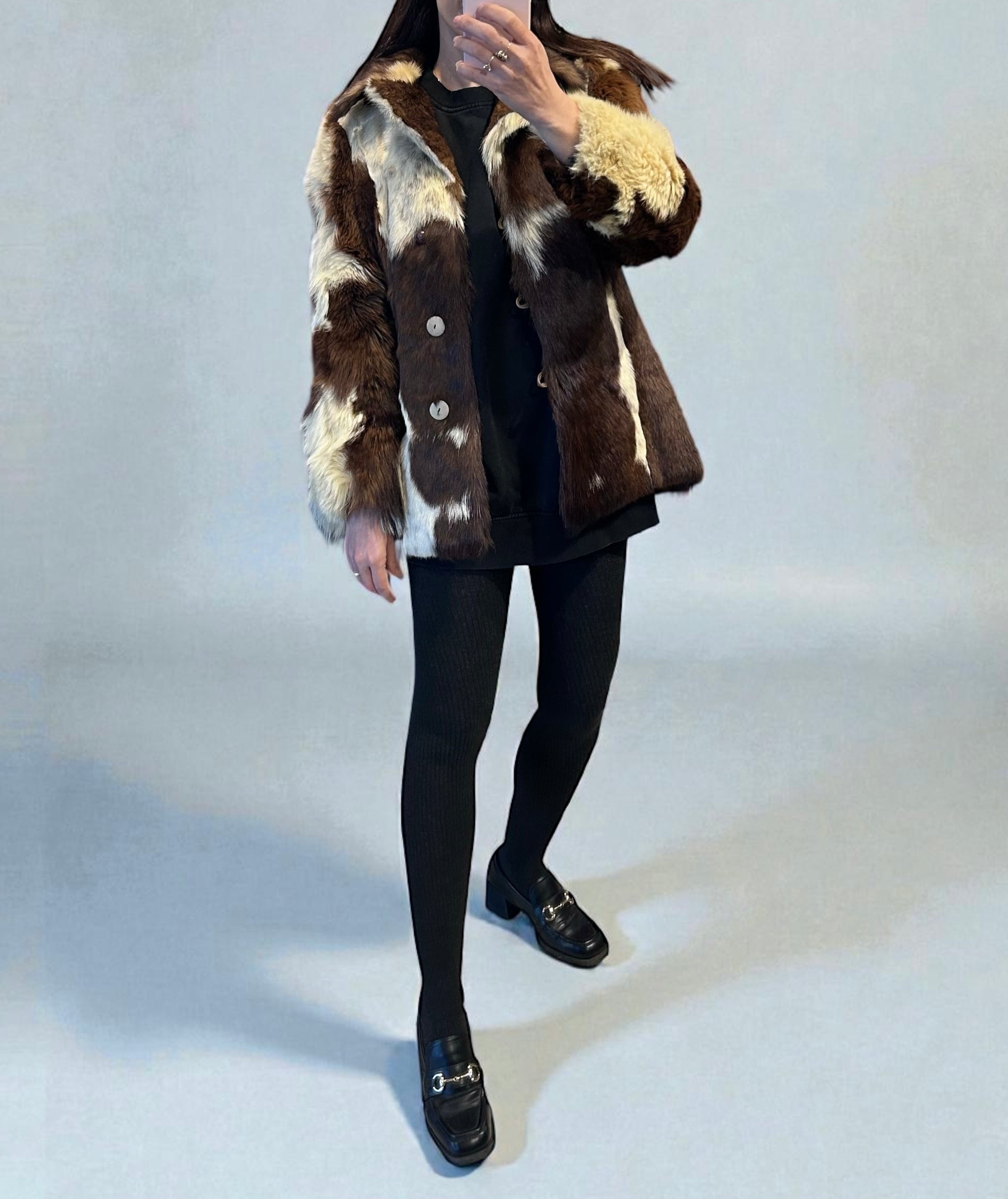 מעיל פרווה וינטג’ נדיר משנות ה־70, עשוי פרווה אמיתית בצבעים טבעיים בגווני חום ושמנת.