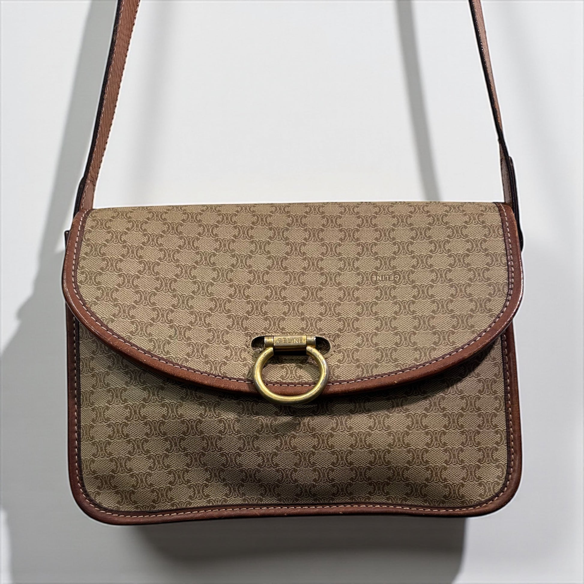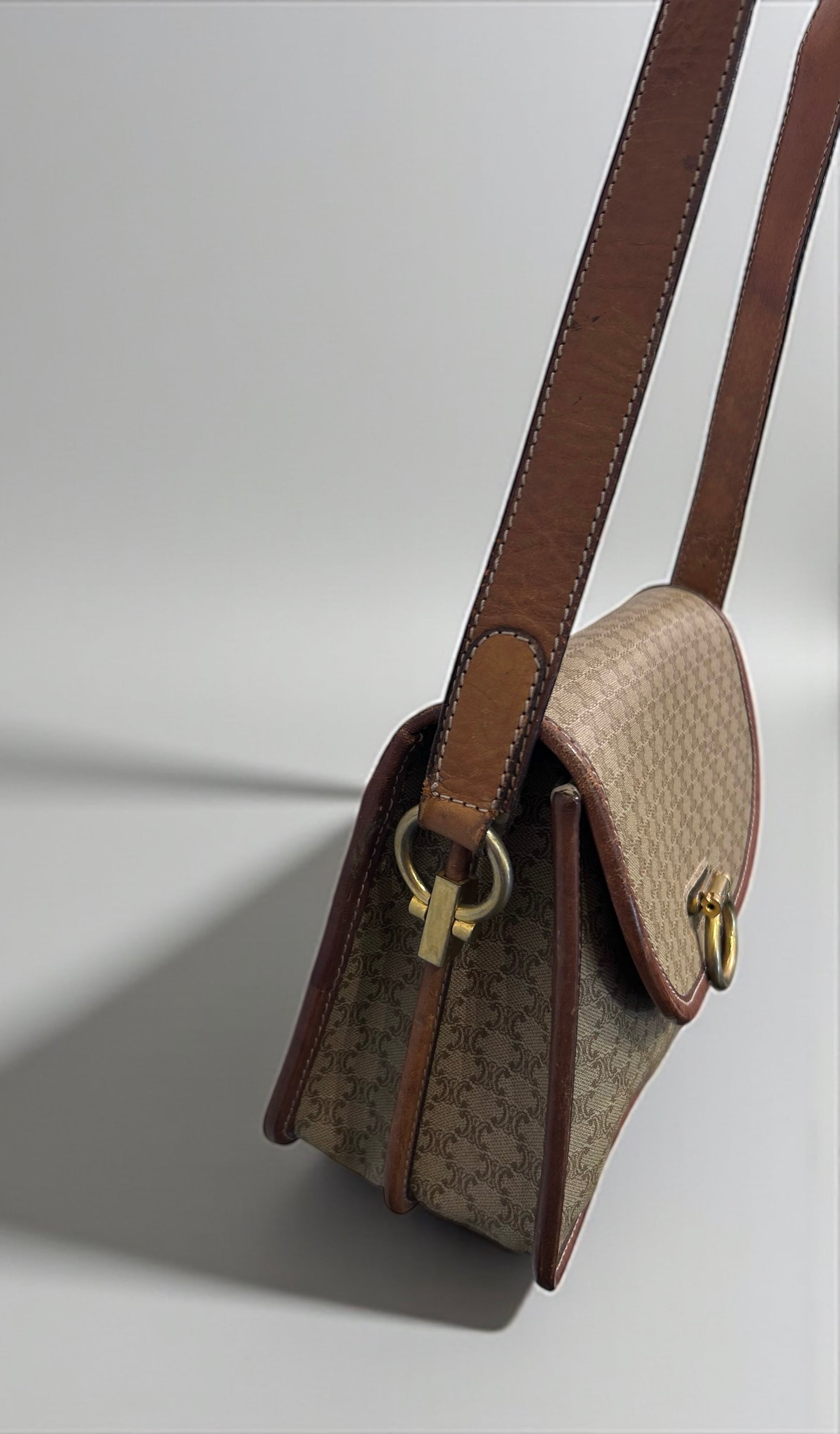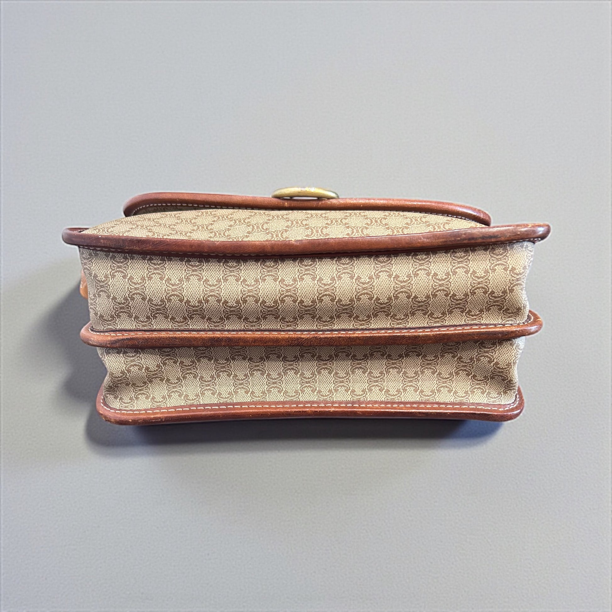 תיק וינטג’ קלאסי מבית האופנה הצרפתי Celine Paris, עשוי קנבס איכותי בגוון חום בהיר עם דוגמת ה־Triomphe המונוגרמית, בשילוב עיטורי עור חום ושוליים תפורים בקפידה.