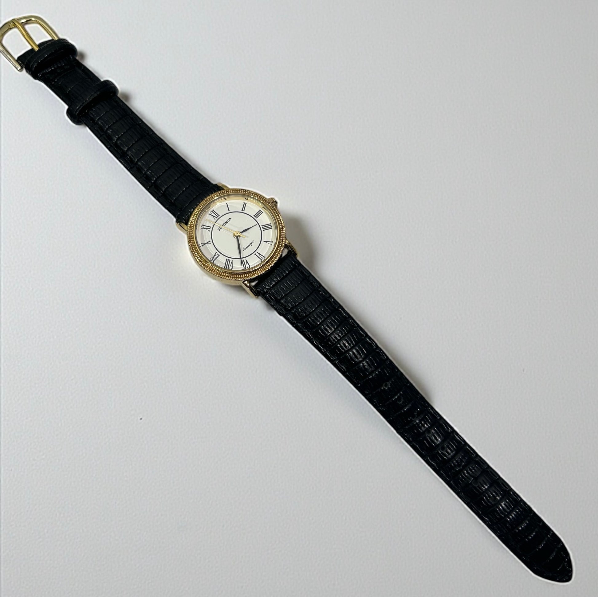 השעון בעיצוב על זמני עם לוח לבן מעוטר ספרות רומיות שחורות, מסגרת מוזהבת מחורצת ורצועת עור שחורה במרקם קרוקודיל.