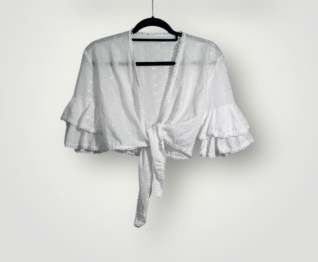 חולצת בוהו לבנה משנות ה-90 עשויה 100% כותנה טבעית ונושמת, בעיצוב רקמה עדינה שמוסיפה מרקם . החולצה נקשרת קדימה בקשר יפהפה שמדגיש את המותן ויוצר מראה מחמיא ורומנטי.