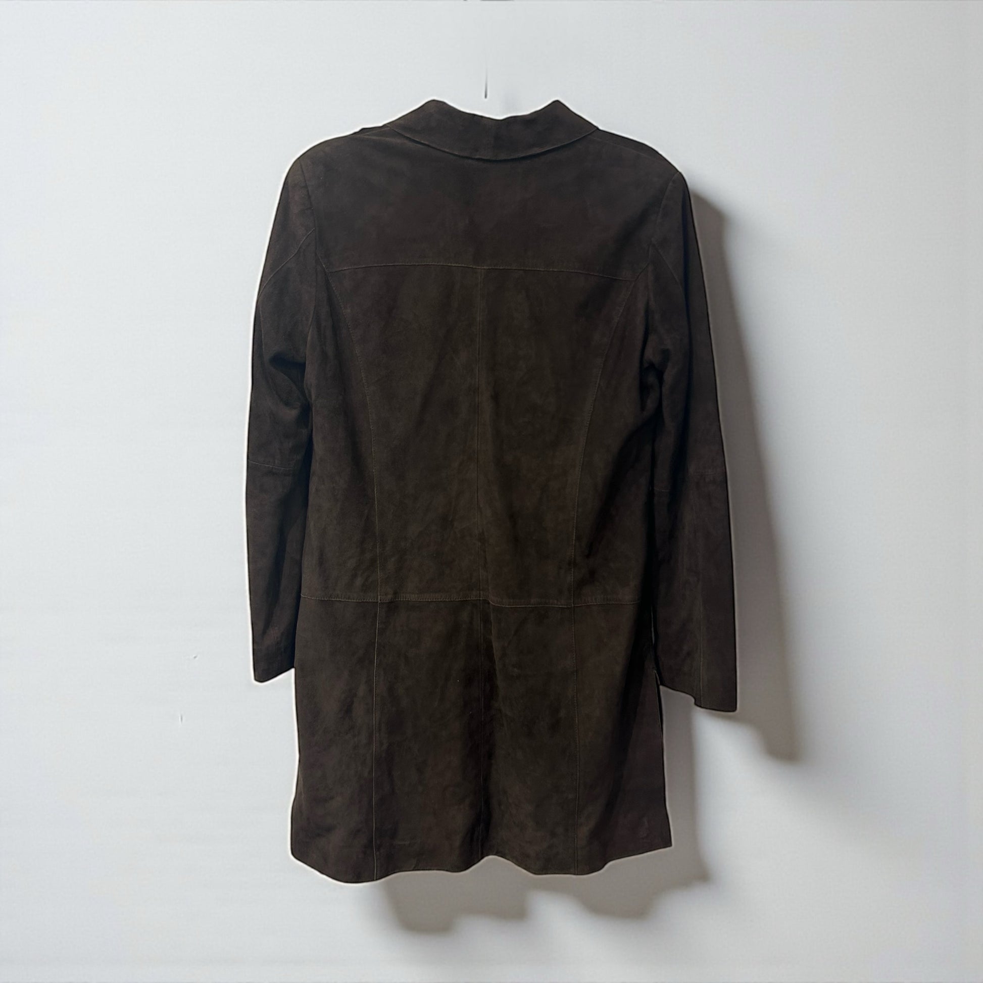 המעיל עשוי זמש ( עור הפוך ) בגוון חום עמוק, ומעוצב בגזרה מחמיאה באורך בינוני, המתאימה ללבישה יומיומית אלגנטית או ללוק ערב רגוע.