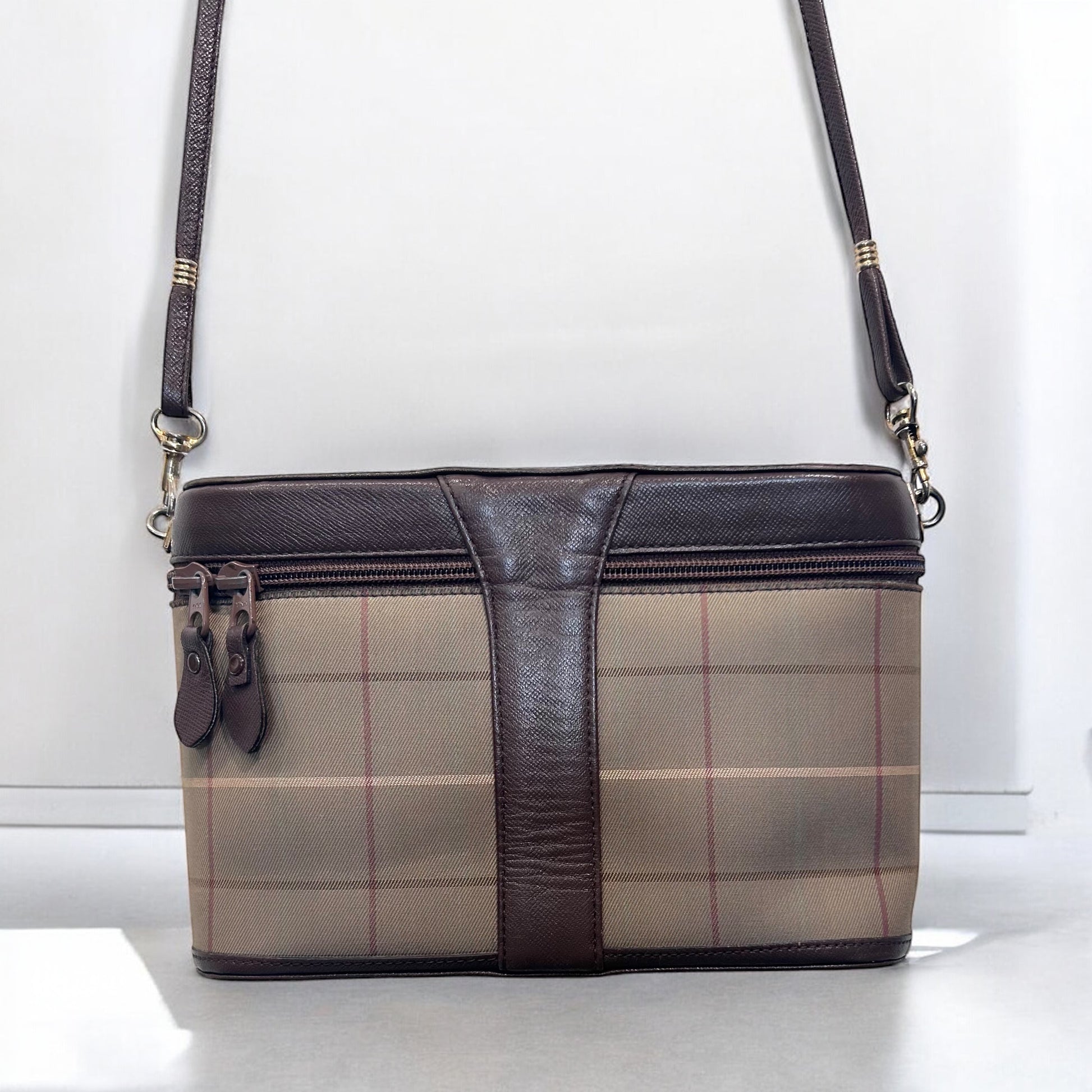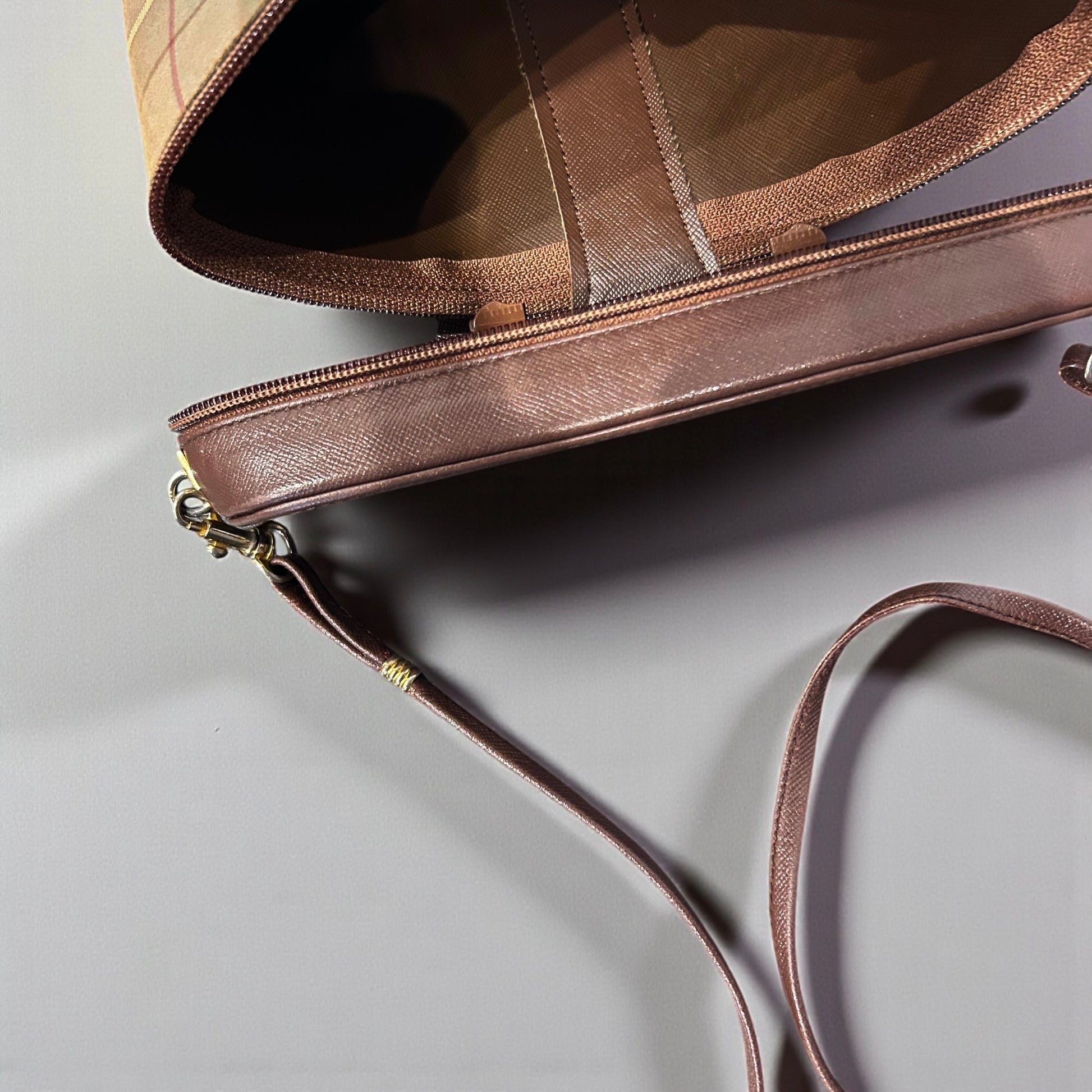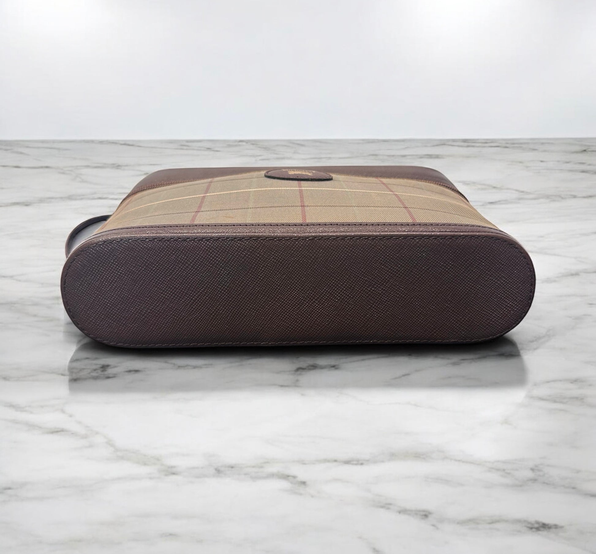תיק וינטג’ של בית האופנה הבריטי Burberry משנות ה־90, בעיצוב מלבני מוקפד עם דוגמת ה־Check האופיינית למותג.