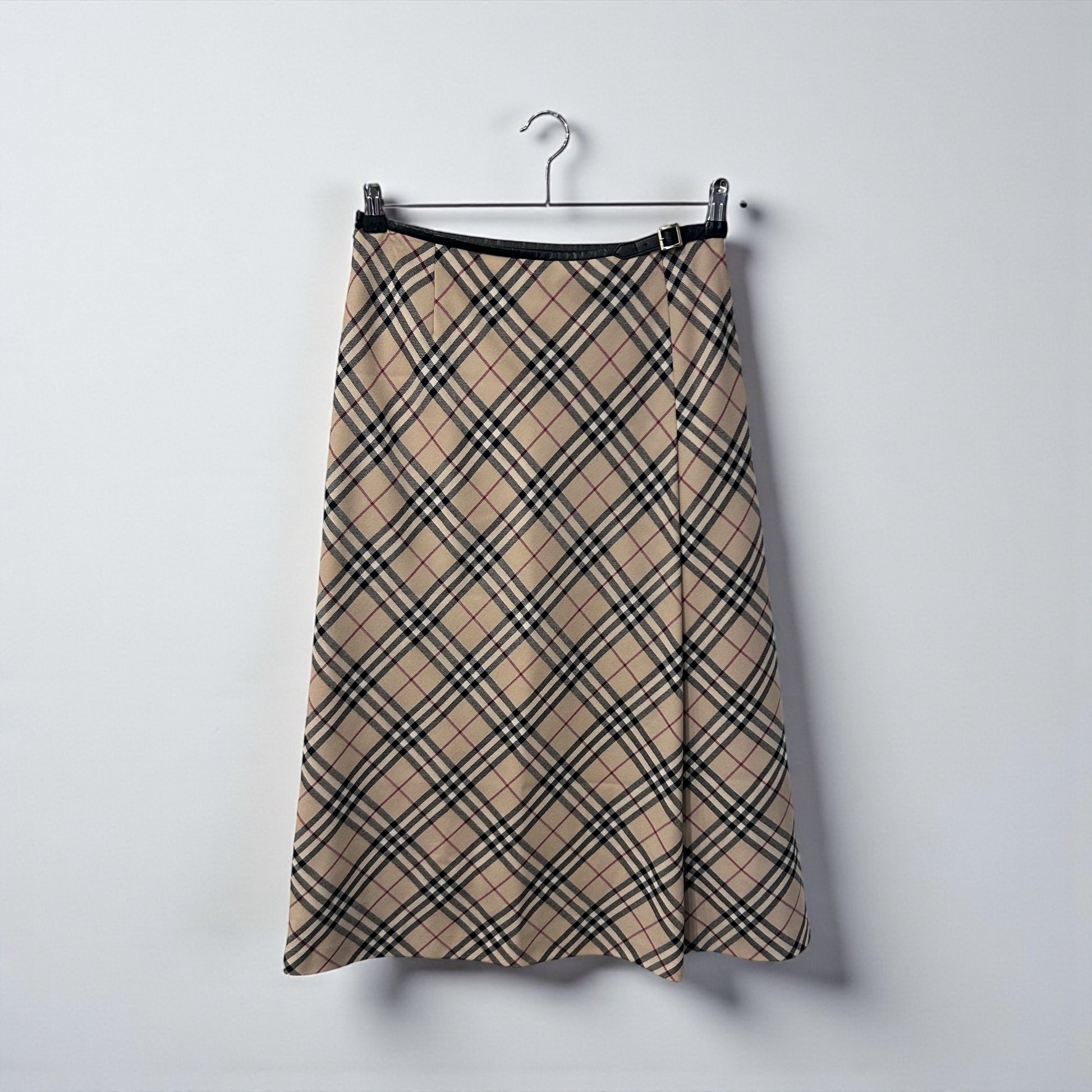 חצאית וינטג׳ באורך מידי מבית האופנה Burberry London בדוגמת המשבצות האייקונית של המותג . לחצאית גזרה נשית מחמיאה הנשפכת בעדינות ויוצרת מראה אלגנטי ועל־זמני.