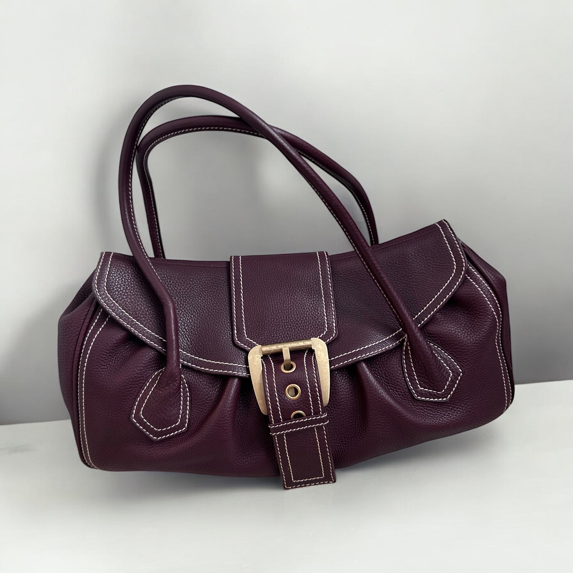 תיק כתף מרשים מבית האופנה הצרפתי Céline, עשוי עור איכותי בגוון בורדו עמוק, עם תפירה קונטרסטית בגוון בהיר שמדגישה את קווי הגזרה והעבודת יד.