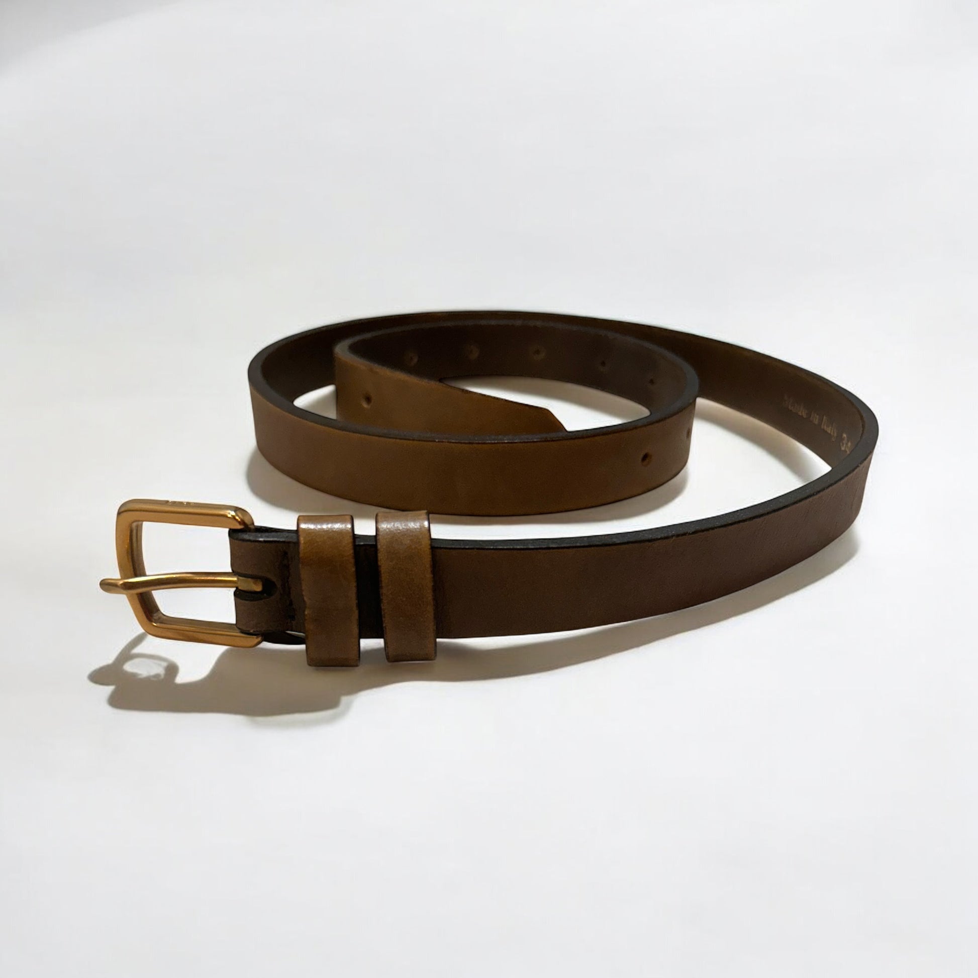 החגורה בצבע חום והאבזם שלה מוזהב עם חריטת לוגו המותג