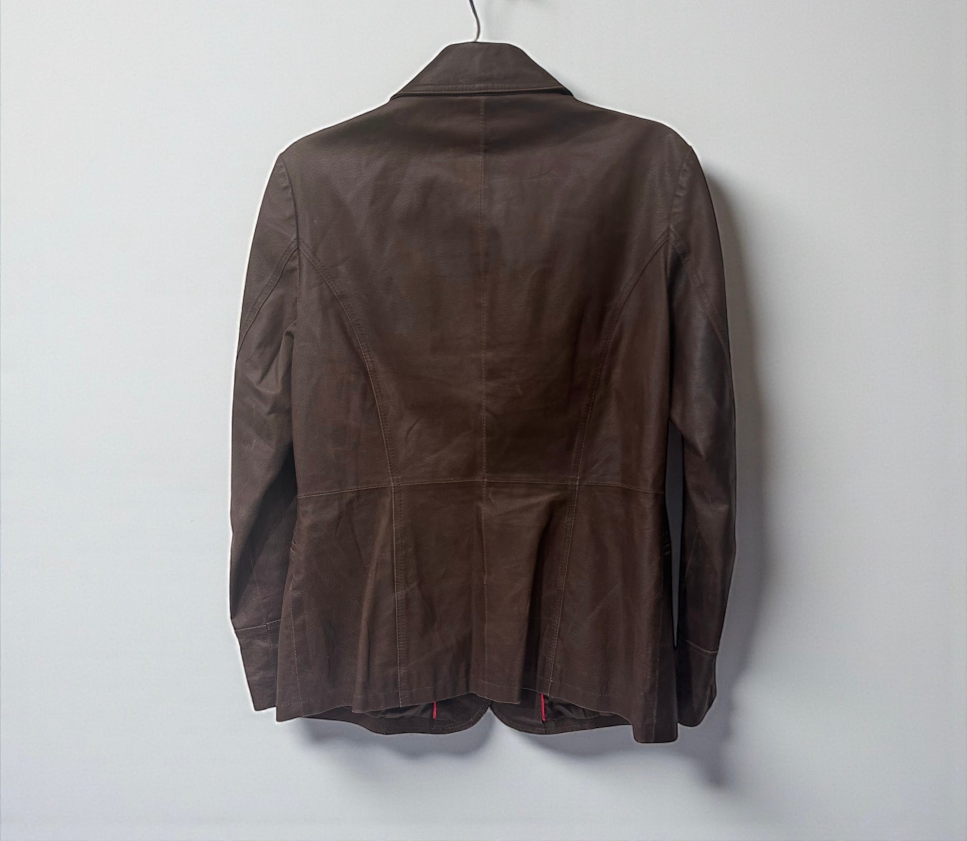 בלייזר עור וינטג’ בגזרה מחויטת, עשוי עור בגוון חום שוקולד עמוק.