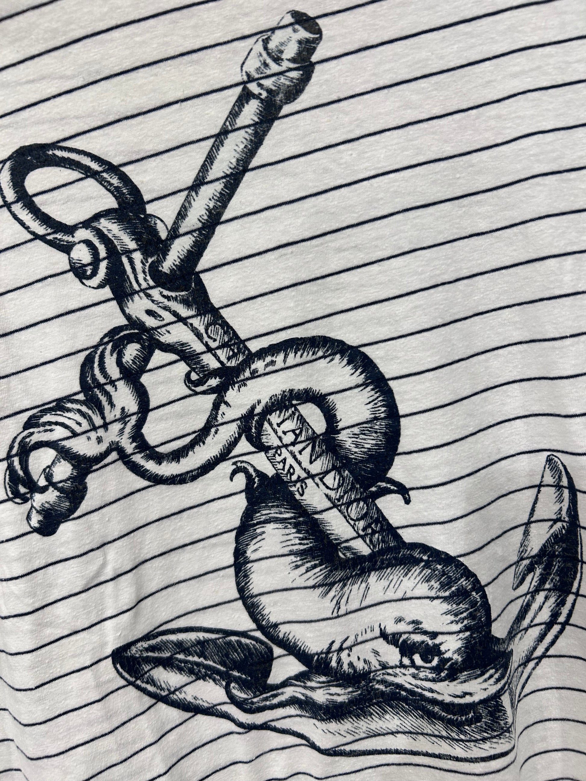 טי־שירט וינטג’ מבית האופנה Christian Dior, בעיצוב פסים דקים בגווני לבן ושחור, עם הדפס מרכזי ייחודי של עוגן מלופף בנחש בסגנון איור קלאסי המזכיר מוטיבים ימיים.