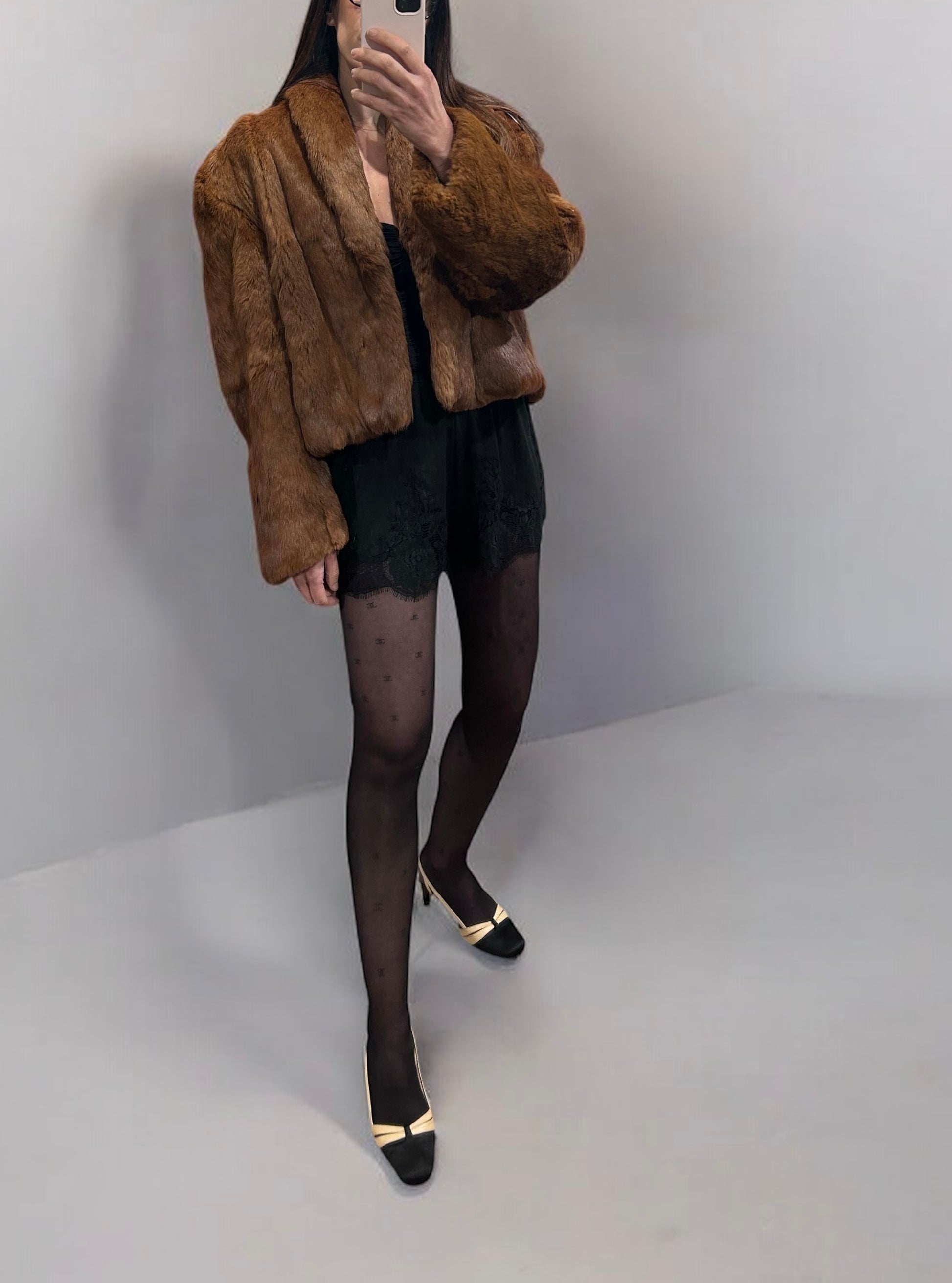 ז׳קט קרופי עשוי פרוות מינק טבעית, בגוון חום חמים ועשיר, מסוף שנות ה־70 – תקופה המזוהה עם צלליות קצרות, נפח רך ומראה יוקרתי אך לא מתאמץ.