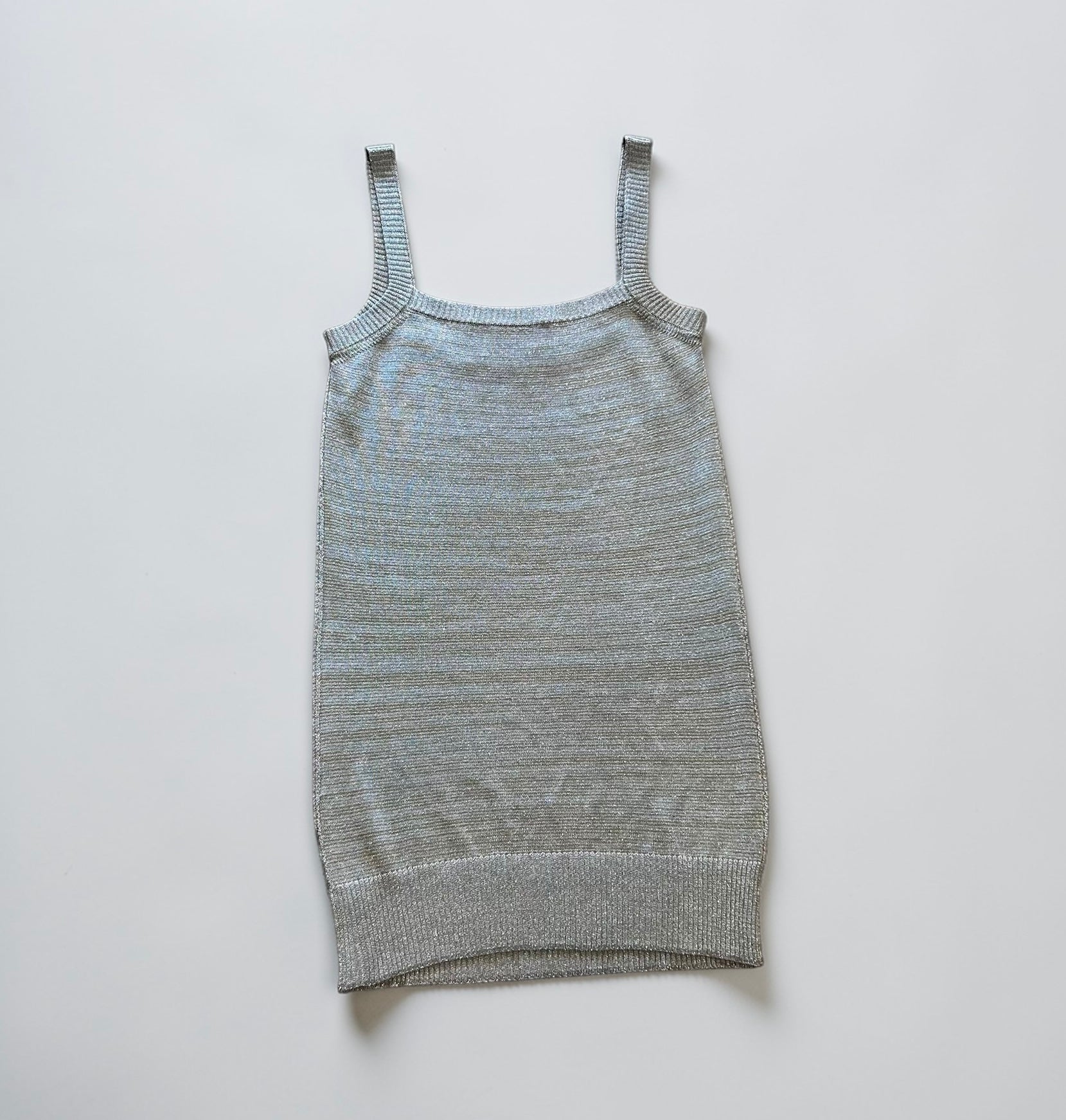 טופ וינטג’ מבית האופנה Dolce & Gabbana עשוי סריג דק עם ברק מטאלי עדין בגוון כסף-שמנת. העיצוב המינימליסטי עם כתפיות דקות וגימורי ריב מעניק לפריט מראה נקי, בעוד הטקסטורה הלורקסית מוסיפה עומק וזוהר עדין.