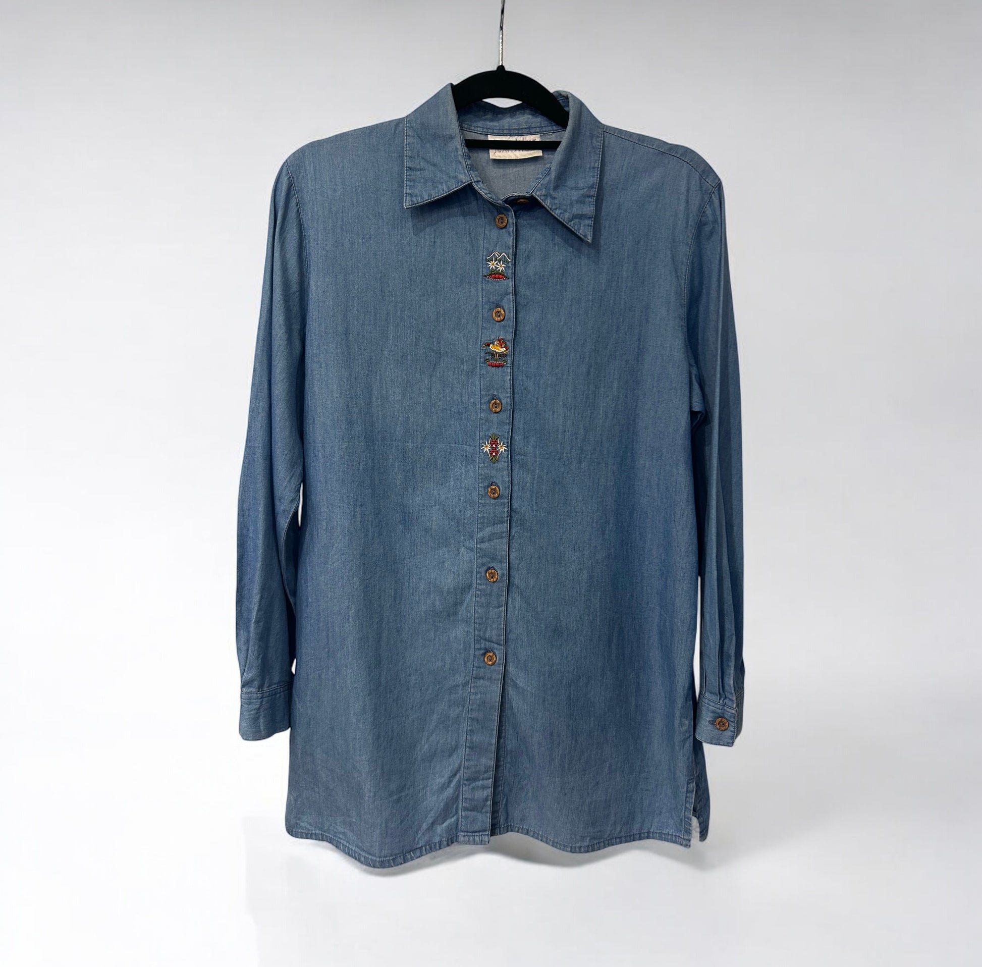 חולצת דנים וינטג׳ בגזרה ארוכה, עשויה בד דנים דק ונעים בגוון כחול שטוף.