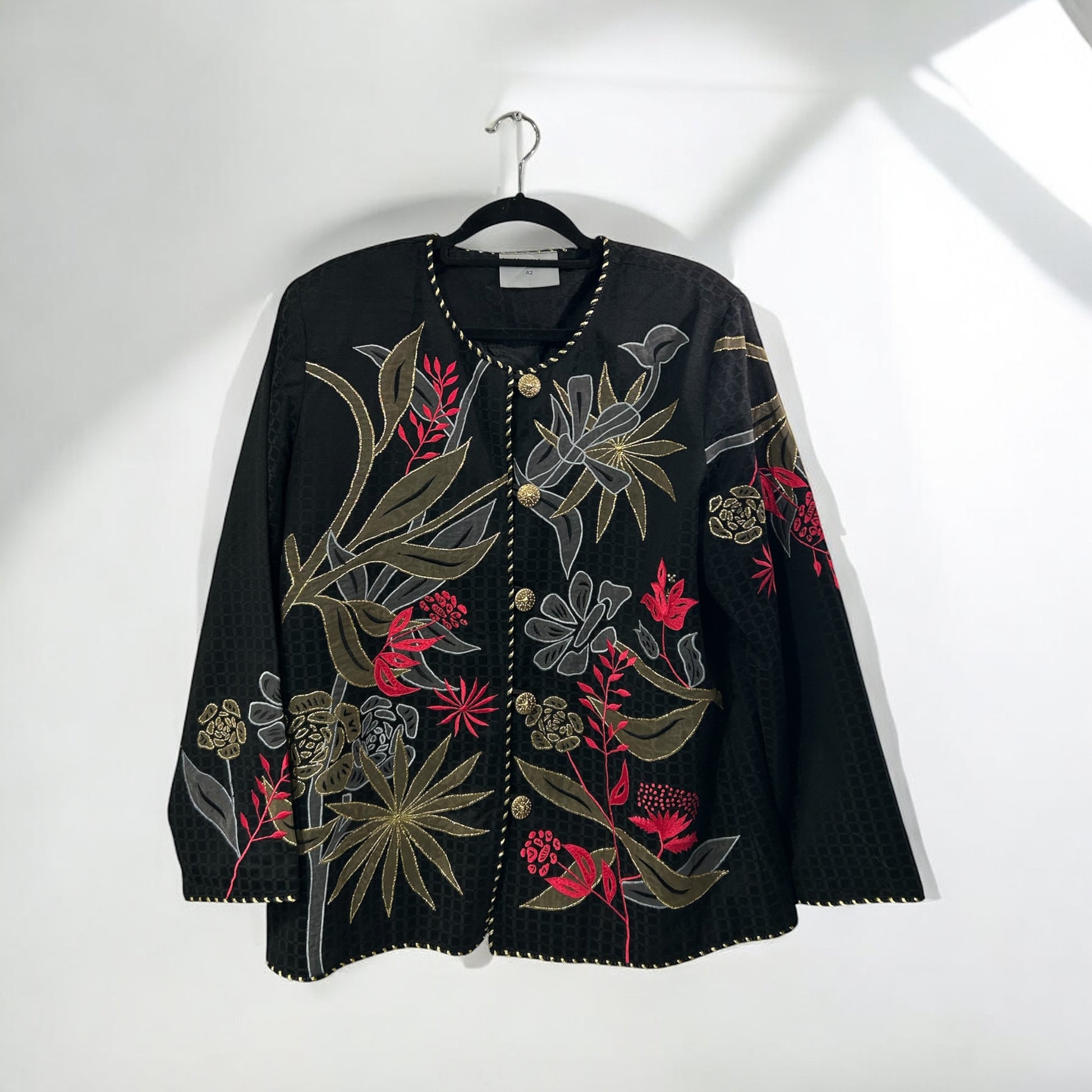 ז׳קט וינטג׳ שכולו רקמה יפיפיה וצבעונית . הז׳קט נסגר באמצעות כפתורי תכשיט בצבע זהב ומצבו מושלם, ללא סימני שימוש .