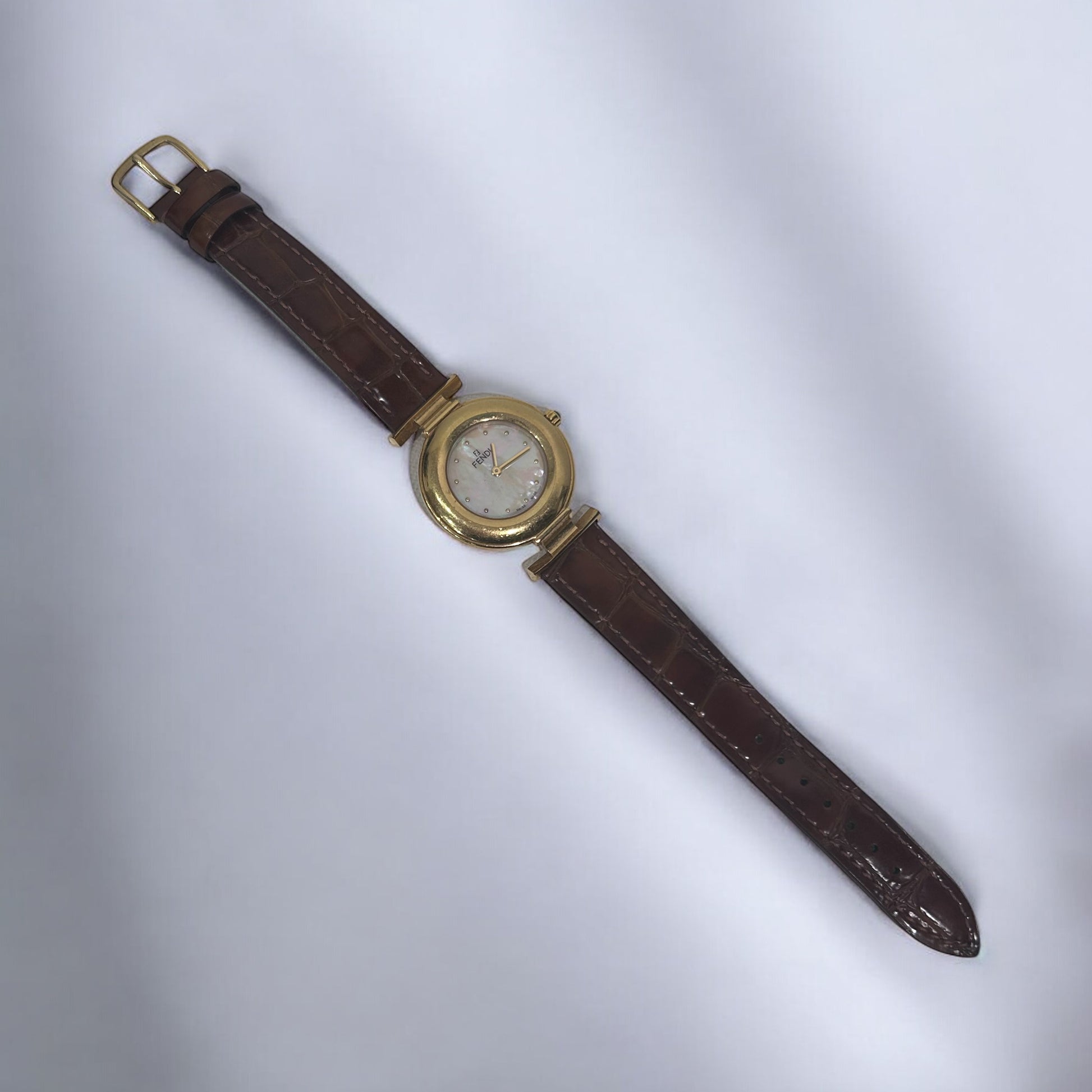 רצועת השעון עשויה עור חום ומנגנון השעון הוא קוורץ