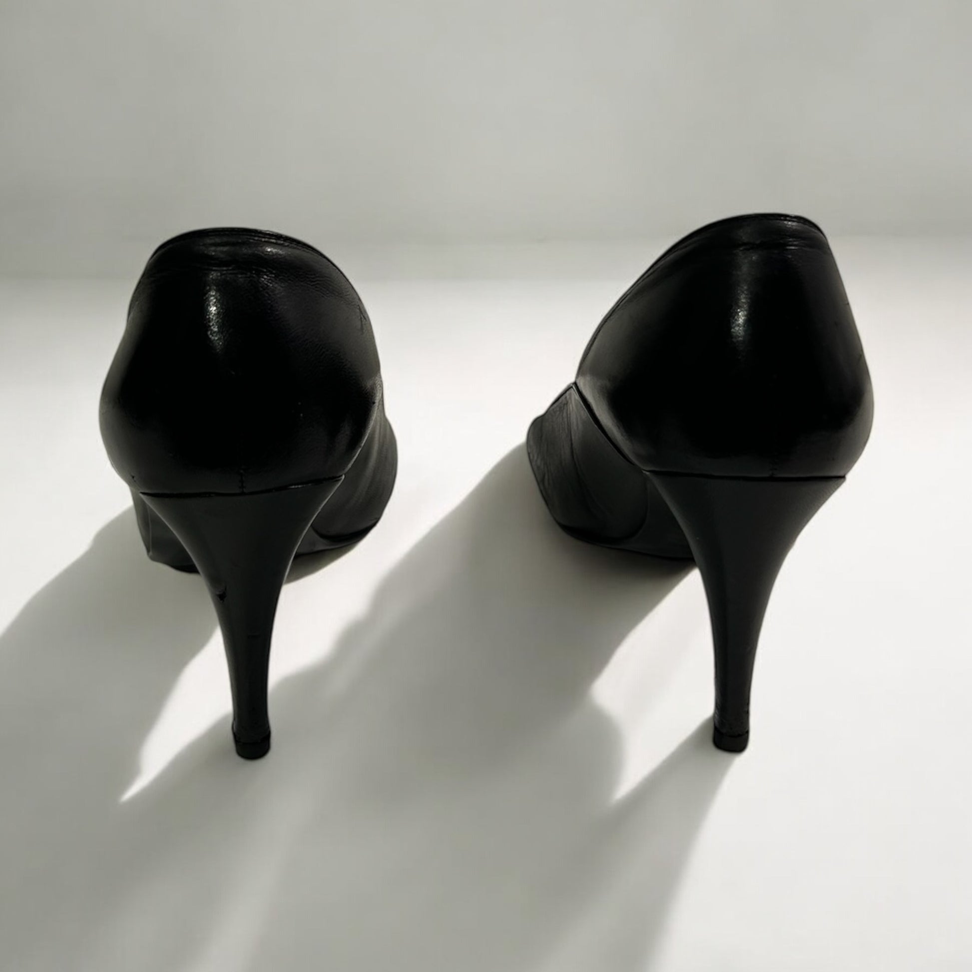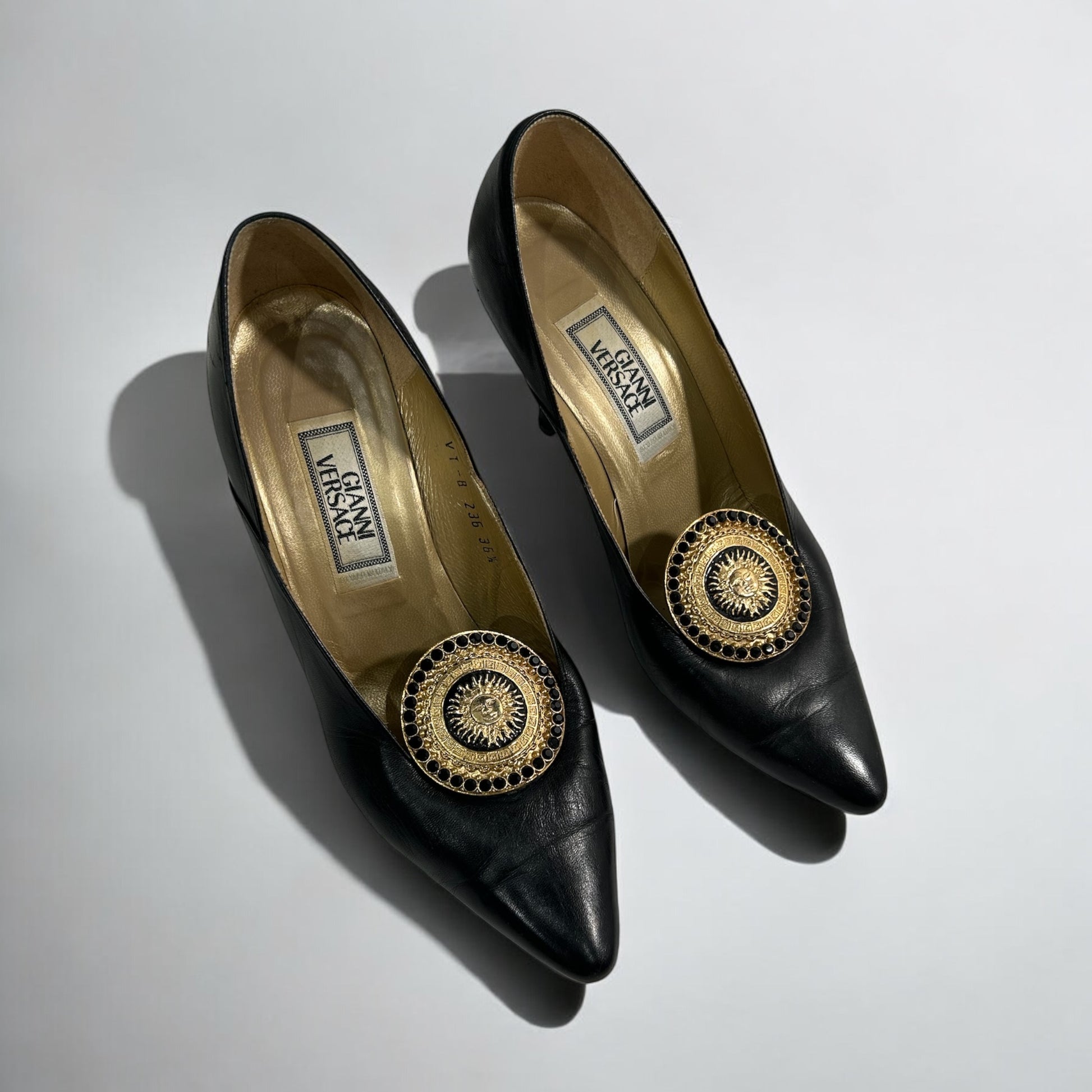 נעלי עקב מבית האופנה האיטלקי ג׳יאני ורסאצ׳ה. הנעליים עשויות עור שחור ובחרטומי הנעליים אבזם עגול מוזהב עם המדוזה המפורסמת שמזוהה כל כך עם המותג . הנעליים במצב טוב ביחס לגילן, שנות ה-80, כולל הסוליות .