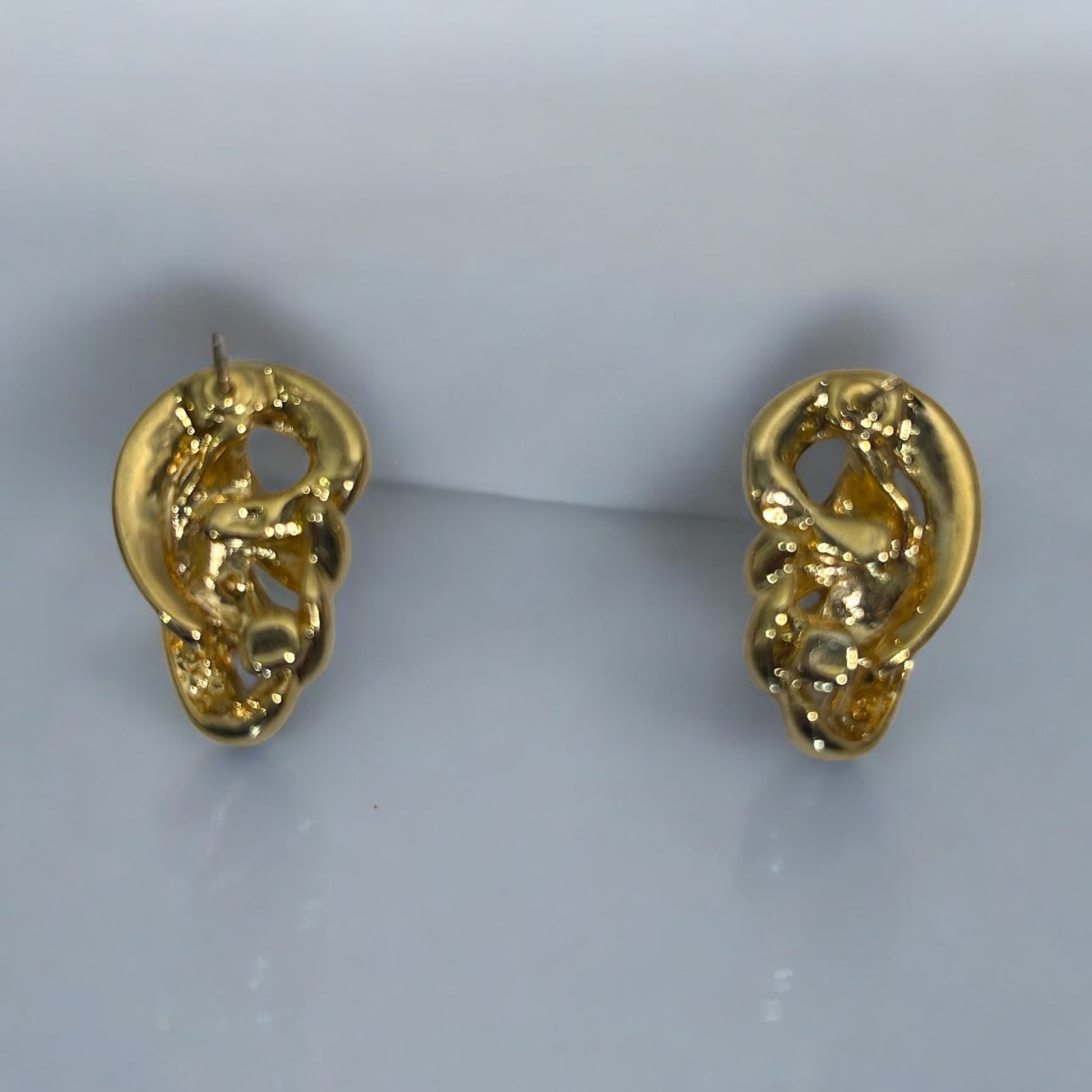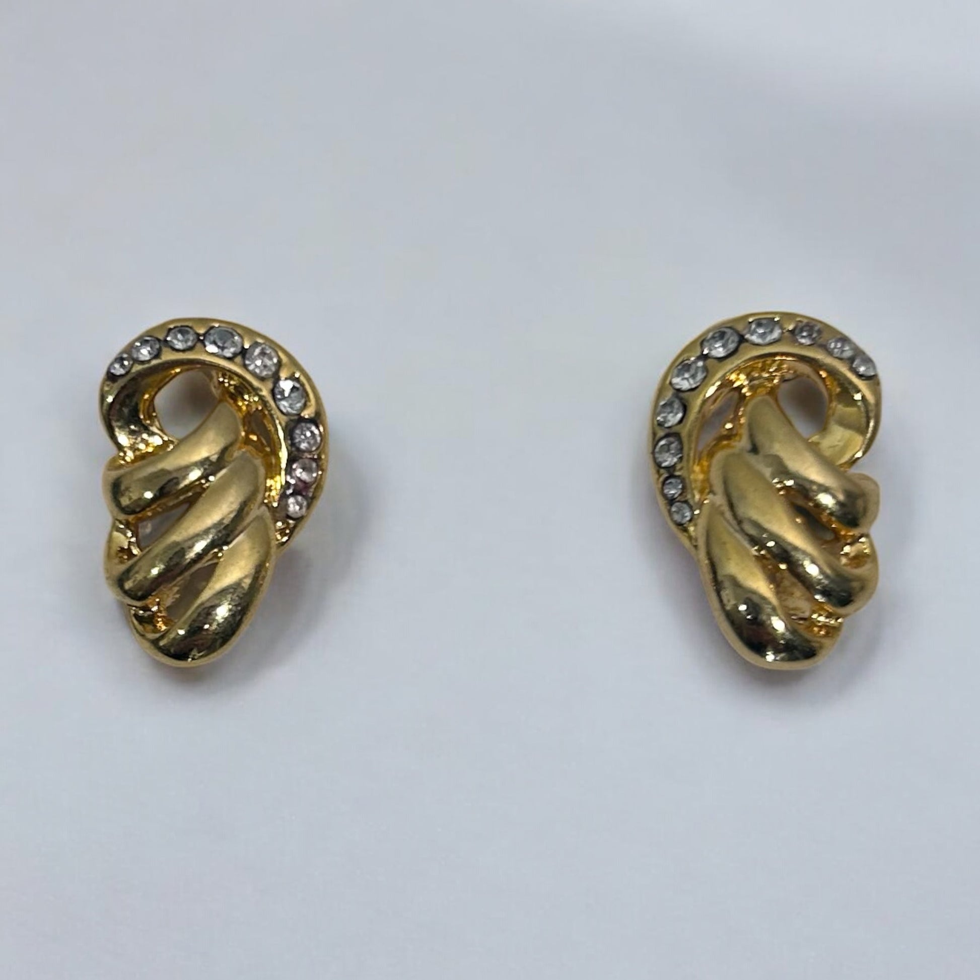 עגילי וינטג׳ מצופי זהב 18 קראט בעיצוב גלי תלת־ממדי עם שיבוץ קריסטלים שקופים לאורך החלק העליון.