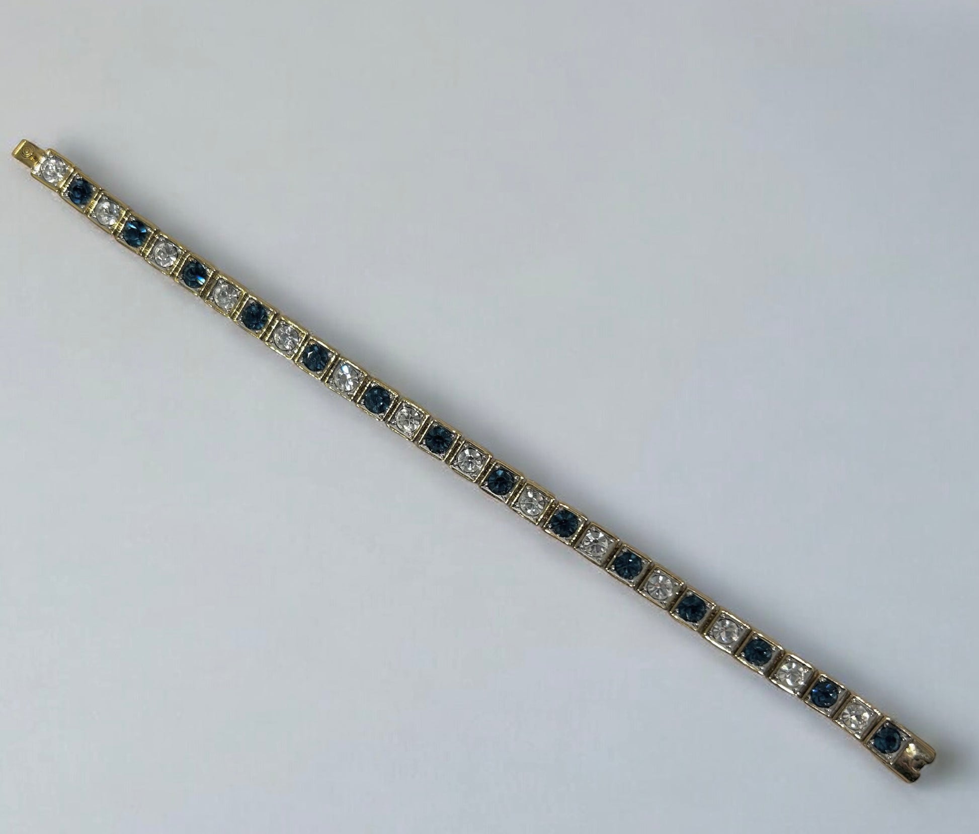 Vintage Gold-Plated Tennis Bracelet with Blue and Clear Stones