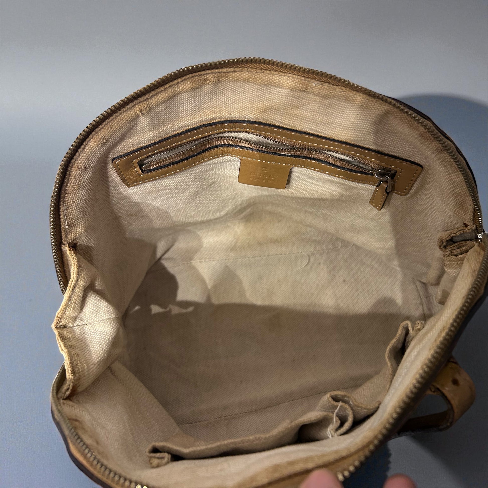 תיק וינטג’ קלאסי מבית האופנה האיטלקי גוצ’י, בעיצוב חצי־עגול המזוהה עם סוף שנות ה־90 ותחילת שנות ה־2000. עשוי קנבס איכותי עם דוגמת GG האייקונית בשילוב עור בגוון חום מוקה בהיר, היוצרים מראה על־זמני.