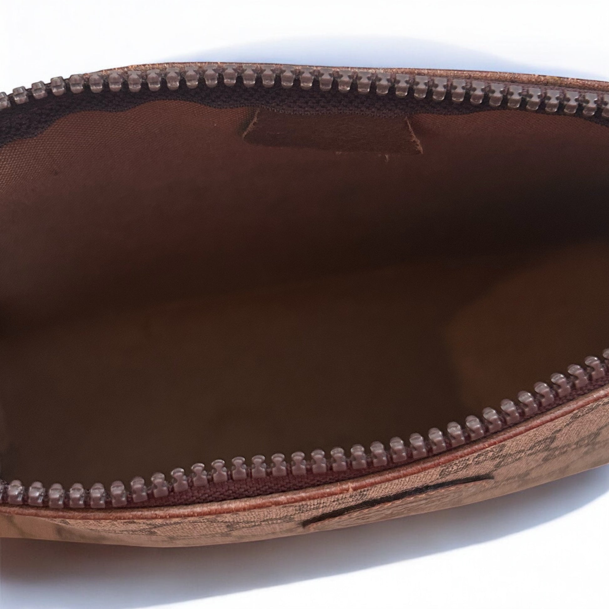 התיק עשוי קנבס בהדפס מונוגראמי עם גימורי עור בצבע חום כהה