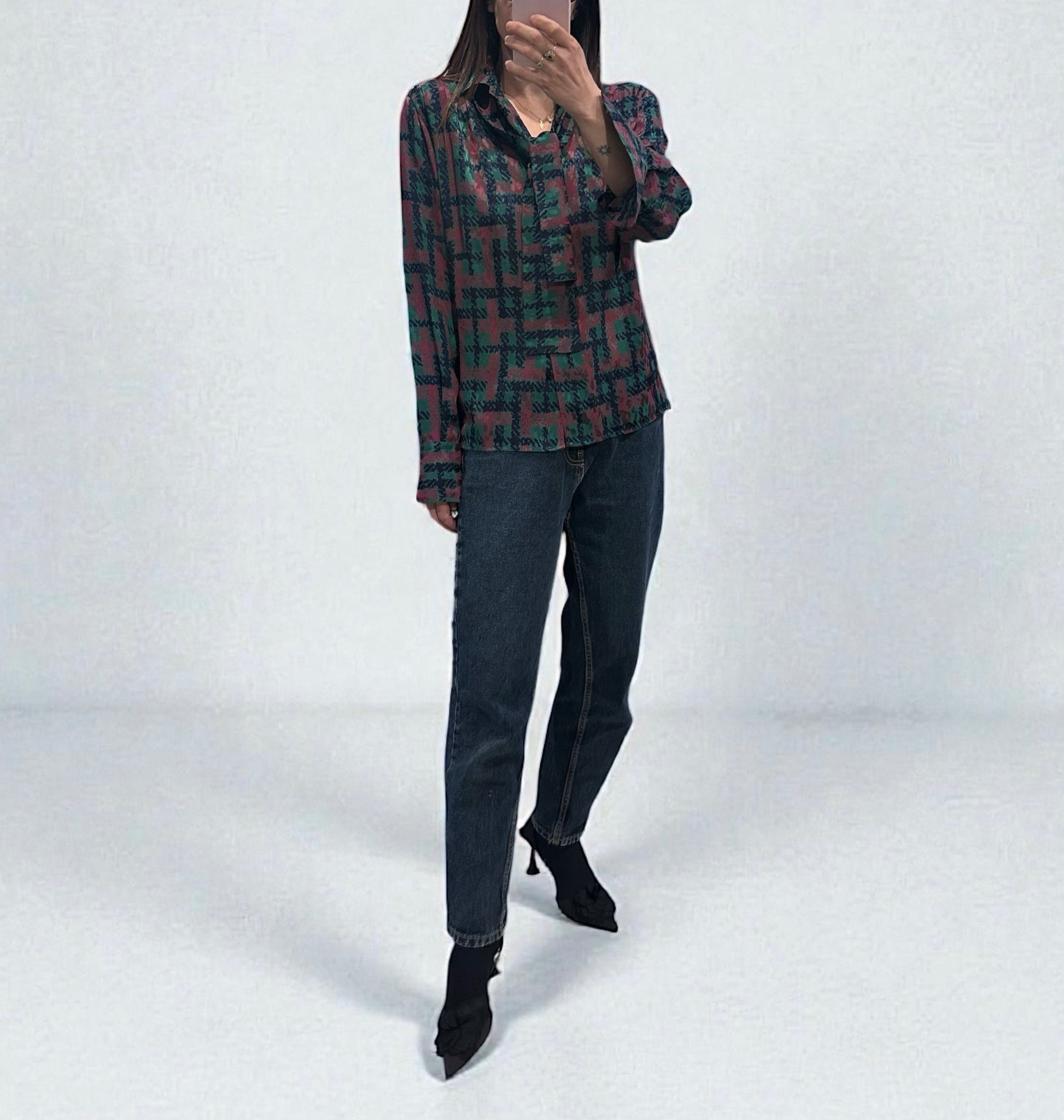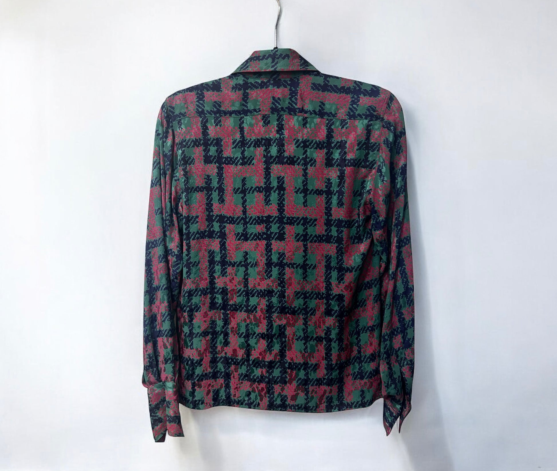 חולצת משי מדהימה ביופיה מבית האופנה Gucci, עשויה 100% משי טבעי קליל ונשפך, עם הדפס גיאומטרי בגווני ירוק, אדום וכחול כהה.