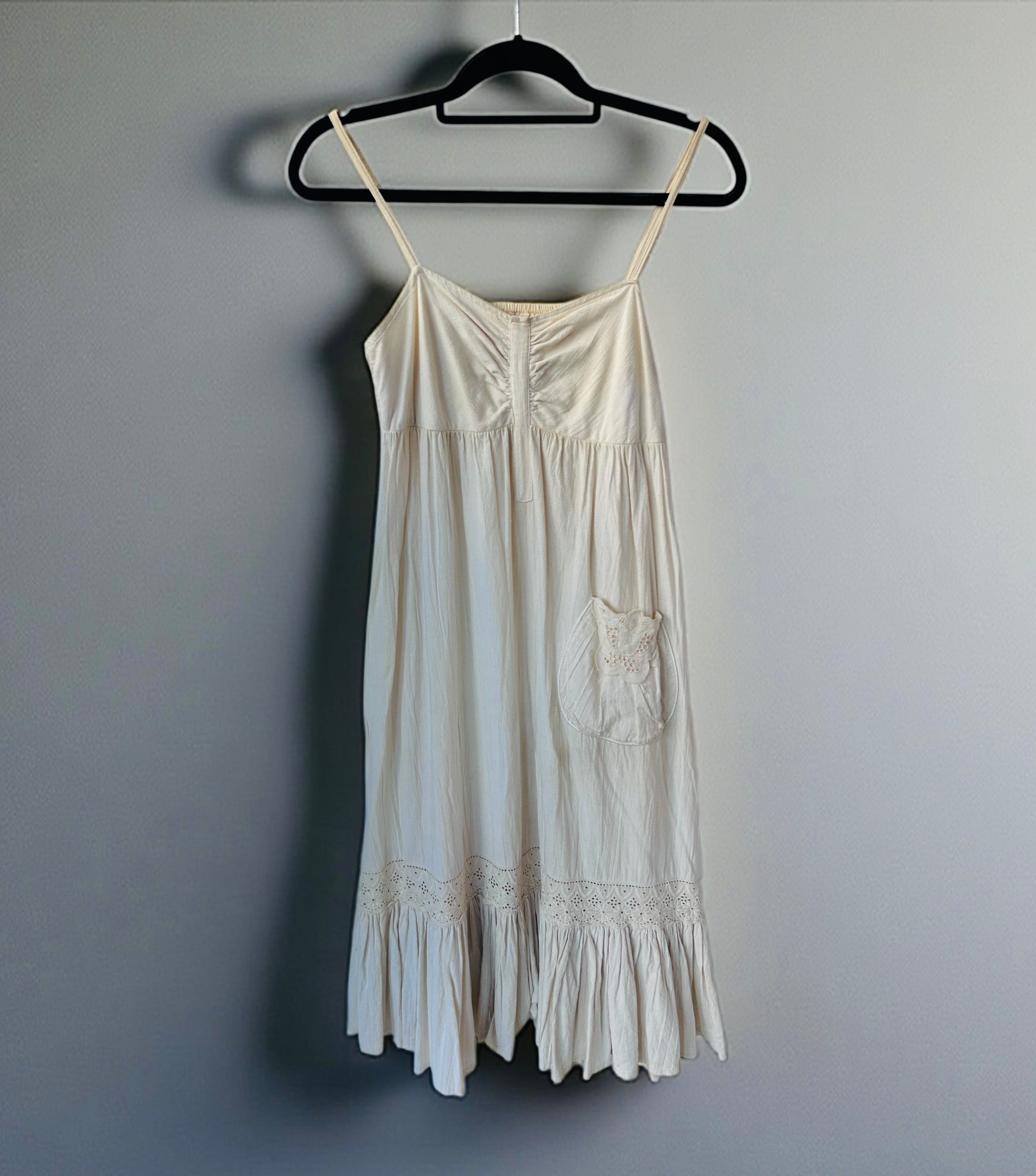 שמלת וינטג׳ רומנטית וקלילה בגוון שמנת, עשויה בד כותנה רך ונעים עם כתפיות דקות. חלקה העליון מעוצב בכיווצים עדינים, והאורך שלה הוא מידי