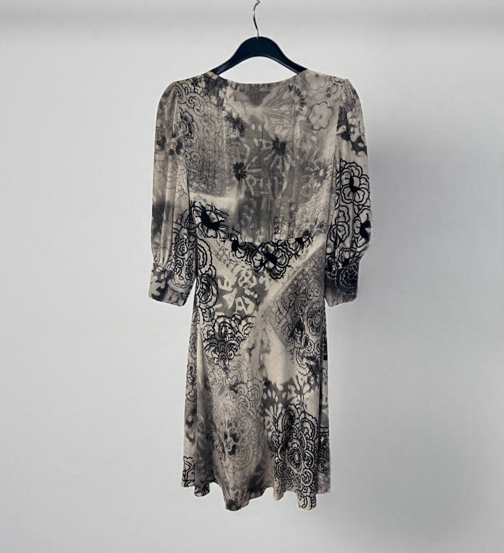 השמלה באורך ברך עם גזרה נשית רכה, מחשוף מעודן ושרוולים באורך ¾, המעוצבים בנפח עדין בקצה. הבד נשפך על הגוף בתנועה טבעית ומחמיאה, עם הדפס אמנותי עשיר בגווני אפור, שחור ושמנת, המשלב מוטיבים אורנמנטליים בסגנון המזוהה עם גליאנו של שנות ה־90 – דרמטי אך מתוחכם.