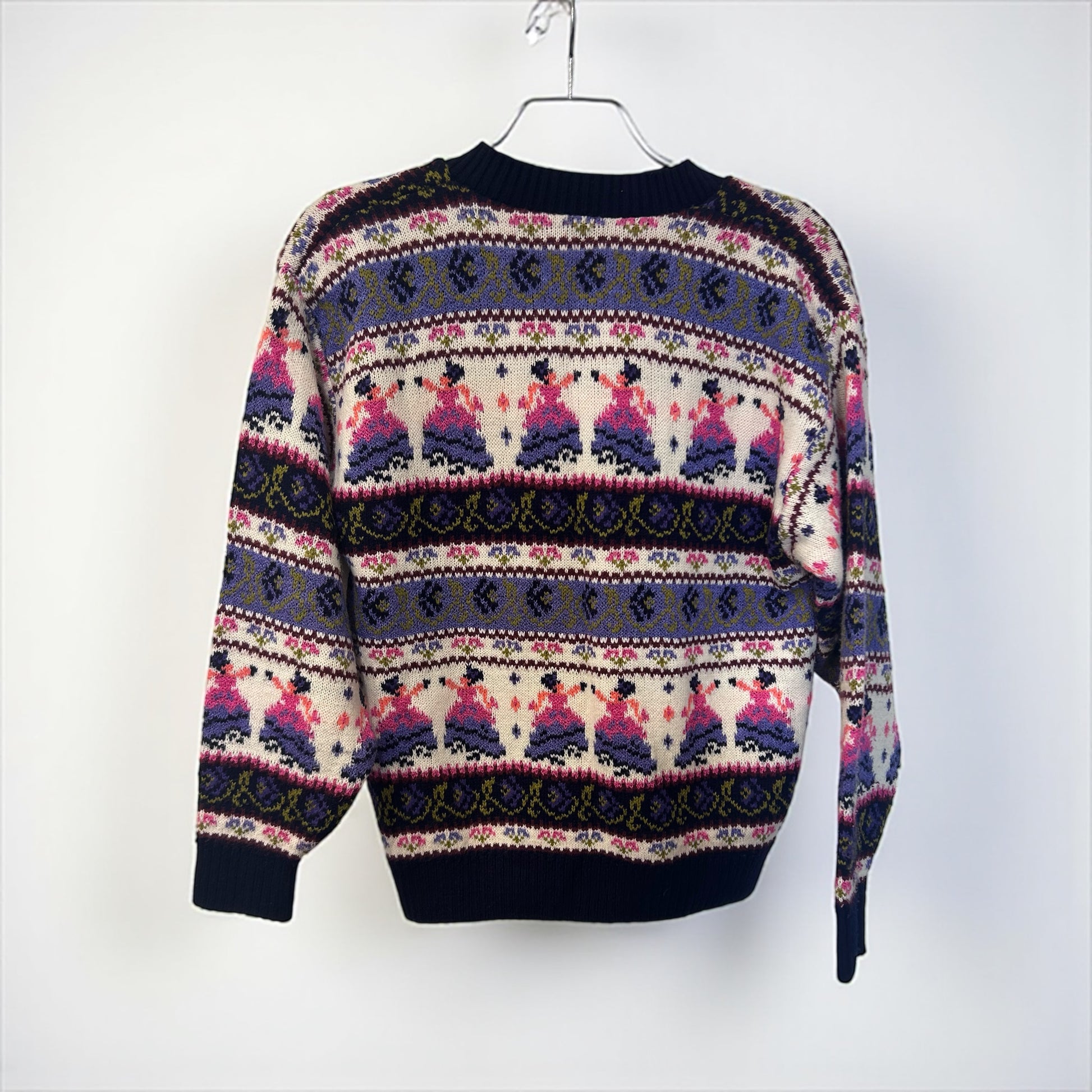קרדיגן וינטג’ בעבודת סריגה צפופה, המעוטר בדוגמה צבעינית בסגנון Fair Isle סקוטי, בגווני כחול, סגול, ורוד וקרם.
