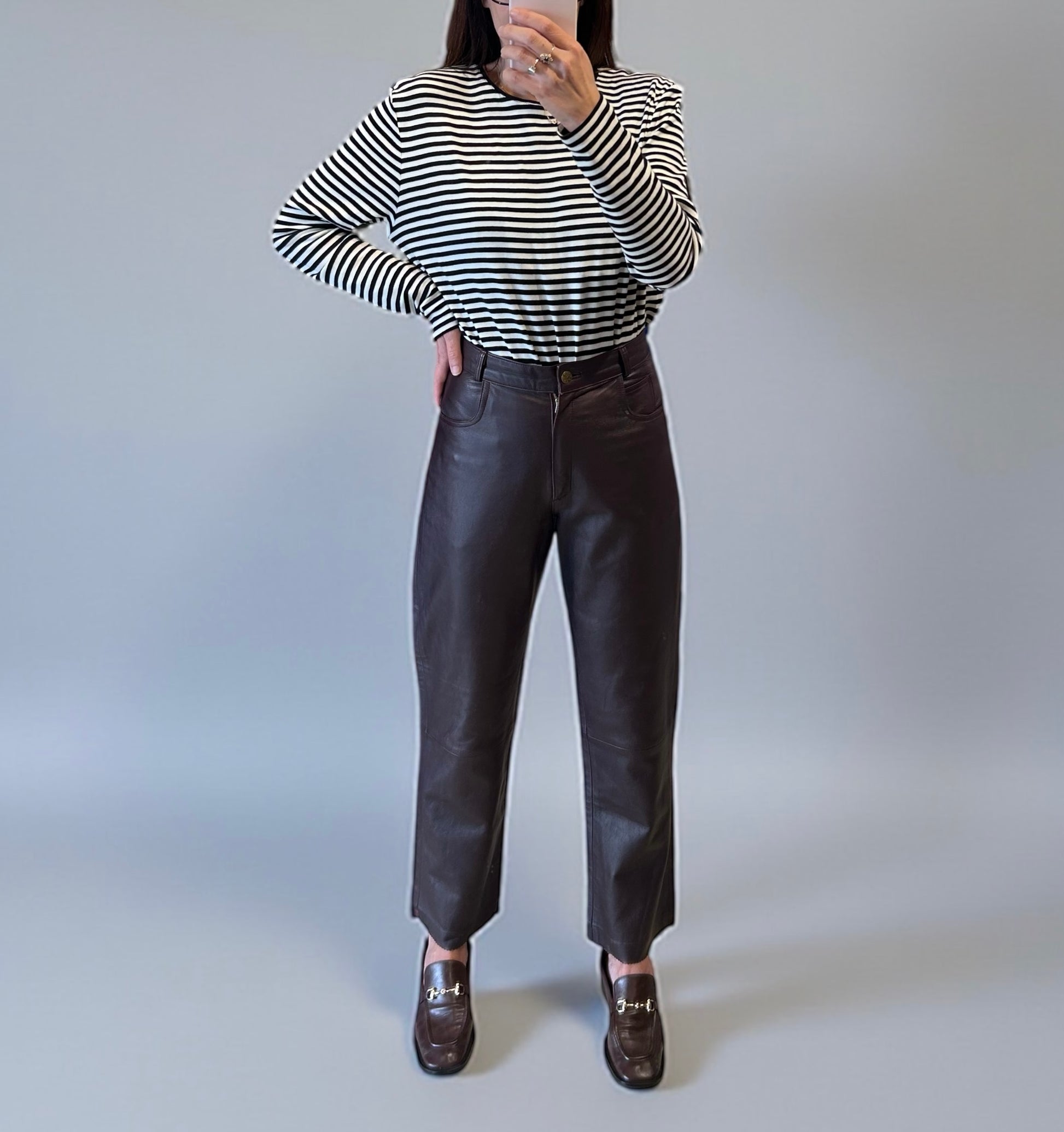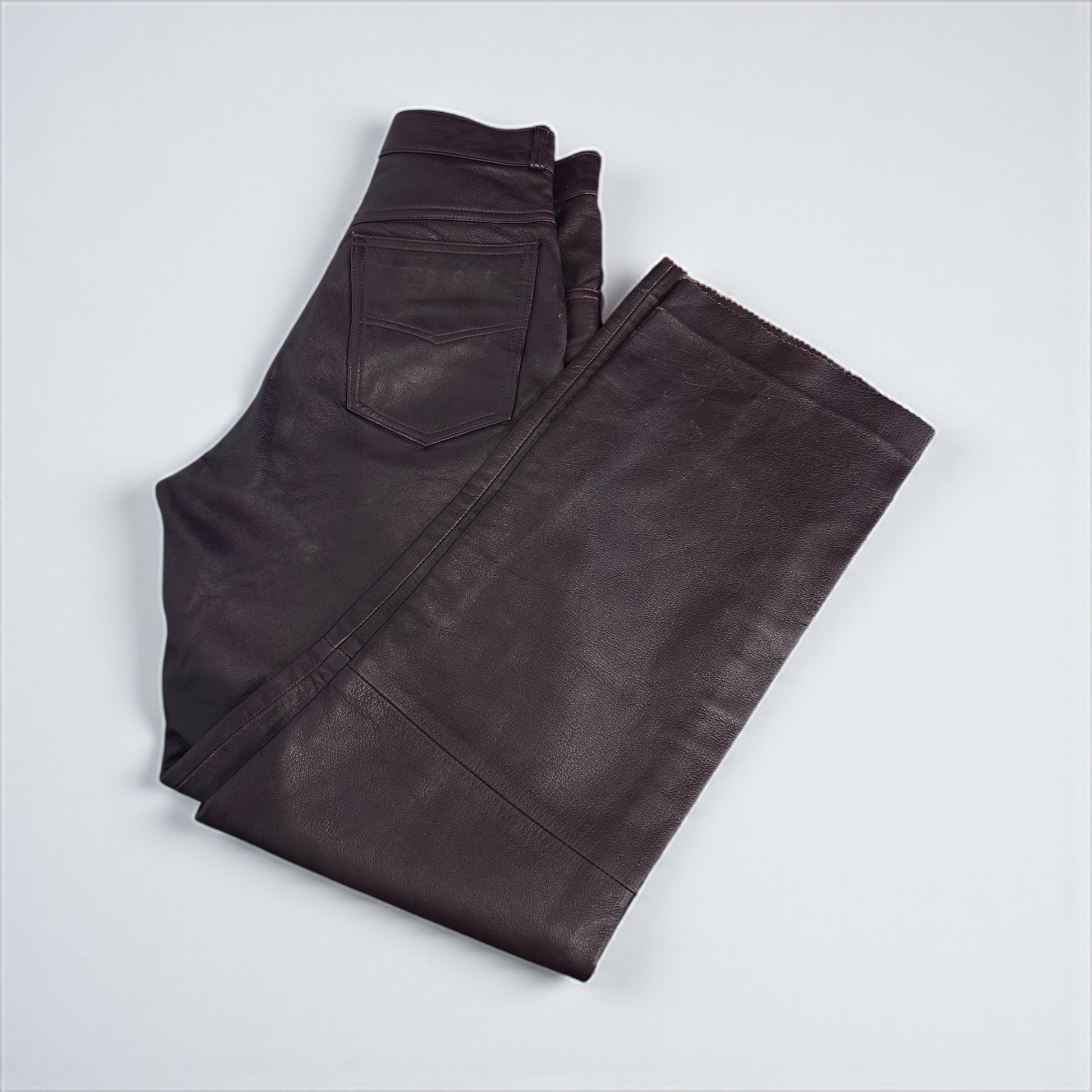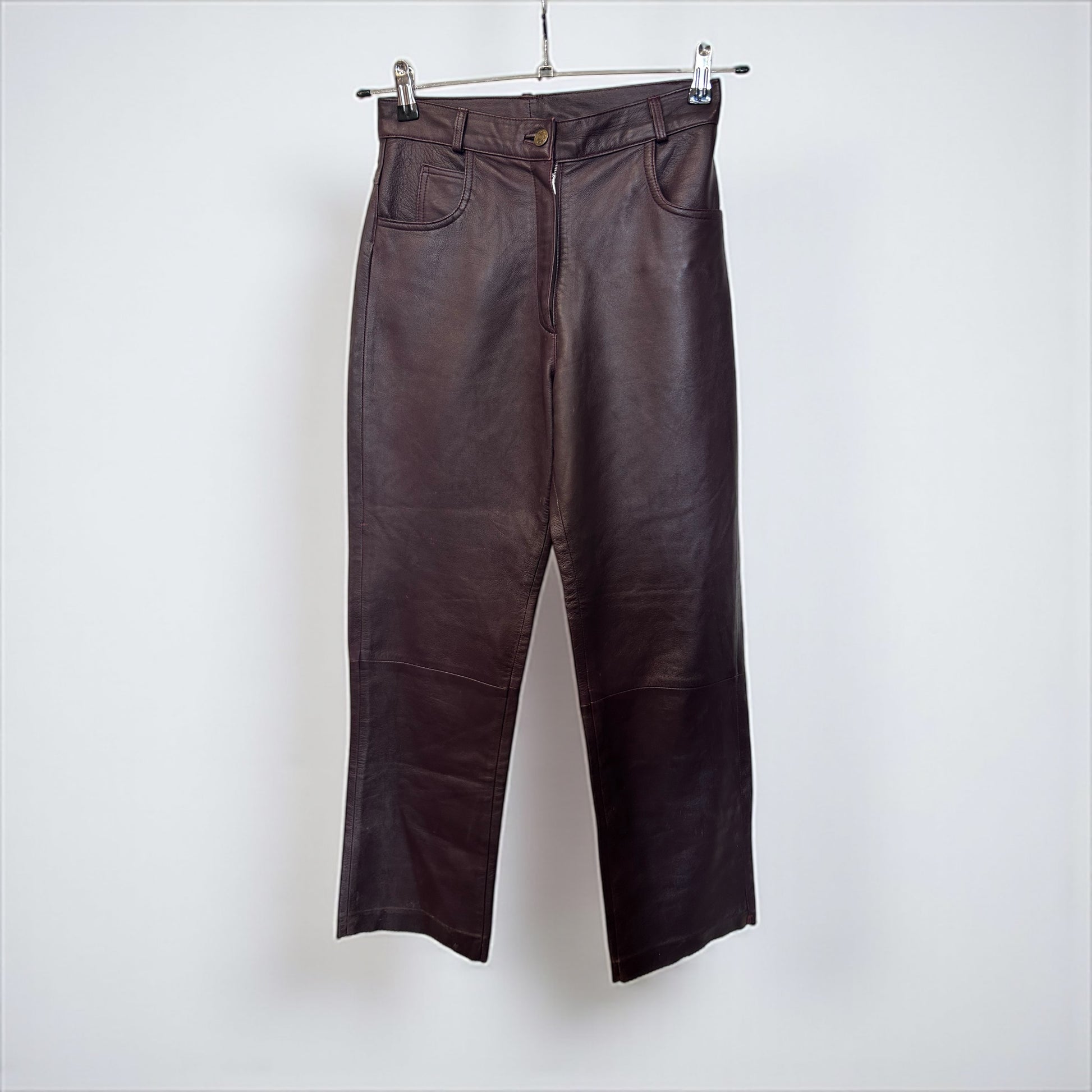 מכנסי עור וינטג’ בגוון סגול כהה ועשויים עור רך ונעים במרקם טבעי.