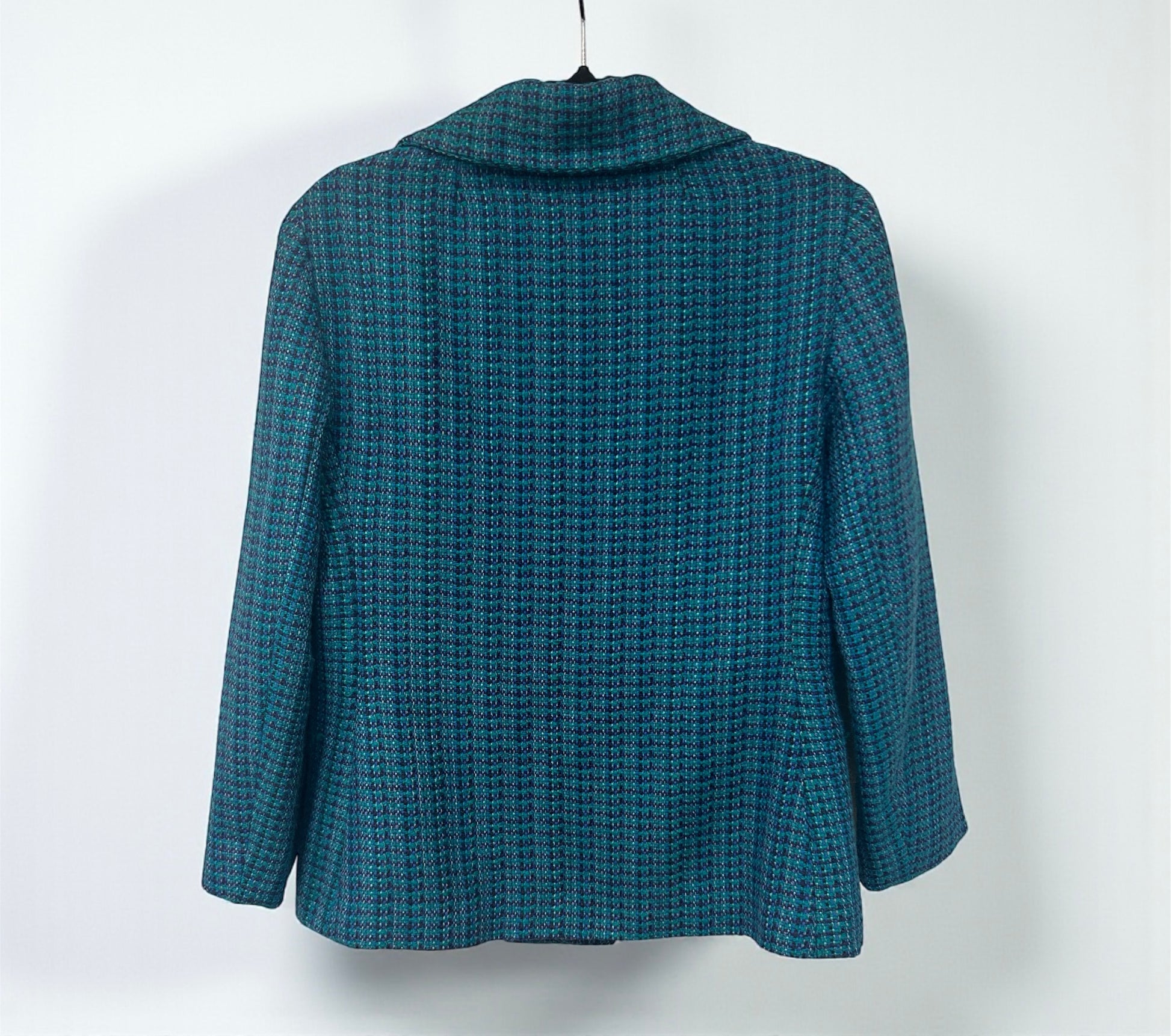 ז׳קט וינטג׳ ייחודי מבית האופנה הישראלי משכית, עשוי צמר ארוג איכותי בגוון טורקיז עמוק עם טקסטורה עשירה.