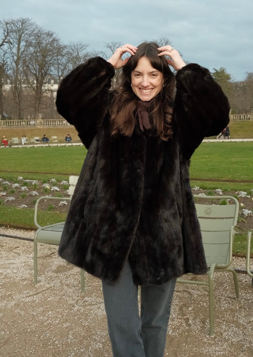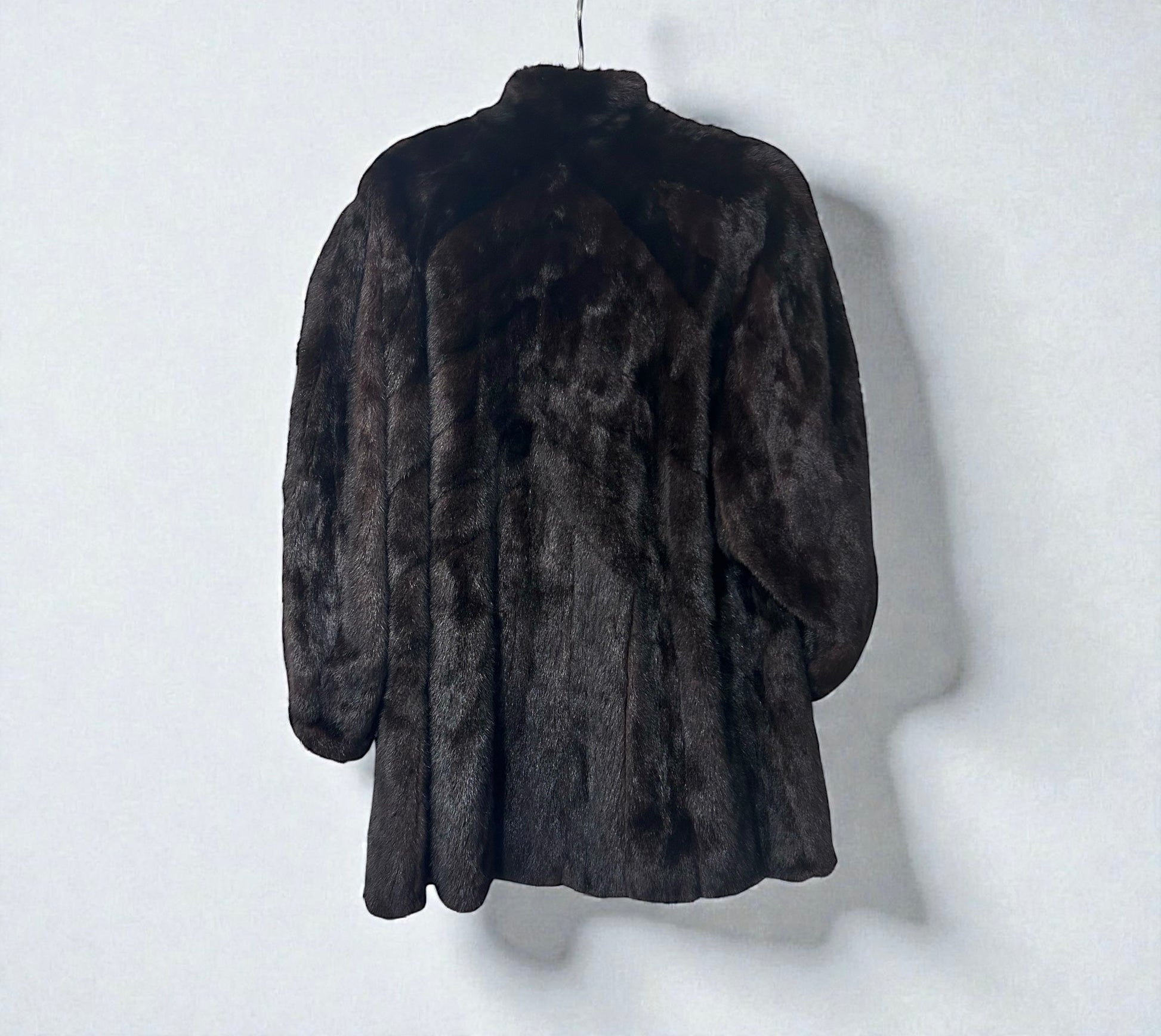 מעיל פרווה וינטג’ משנות ה-90 עשוי מינק (Mink) בגוון חום־שוקולד כהה עם ברק טבעי עמוק ומרקם עשיר במיוחד. המעיל בגזרה רחבה ומעט מתרחבת, עם שרוולים תפוחים שמעניקים נוכחות אלגנטית ודרמטית.