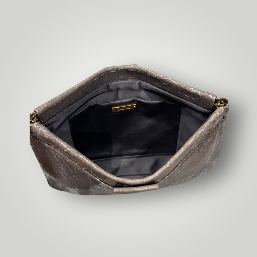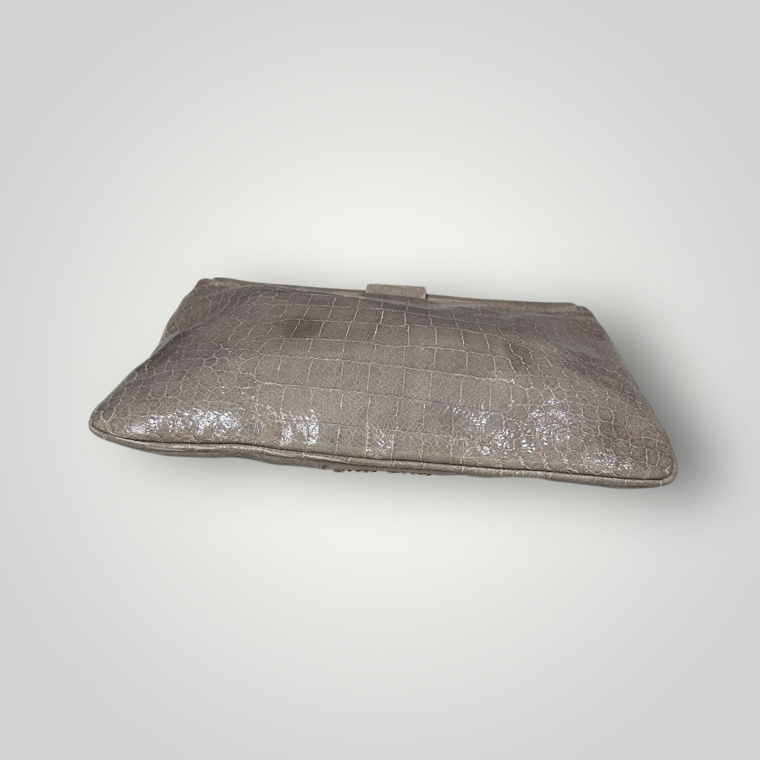קלאץ’ וינטג’ מבית האופנה האיטלקי Miu Miu מתחילת שנות ה־2000, עשוי עור בטקסטורה של קרוקודיל עם גימור מבריק בצבע אפור אלגנטי.