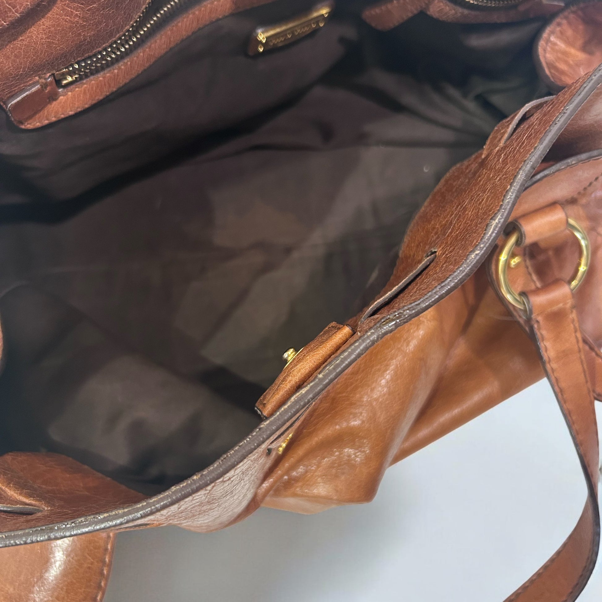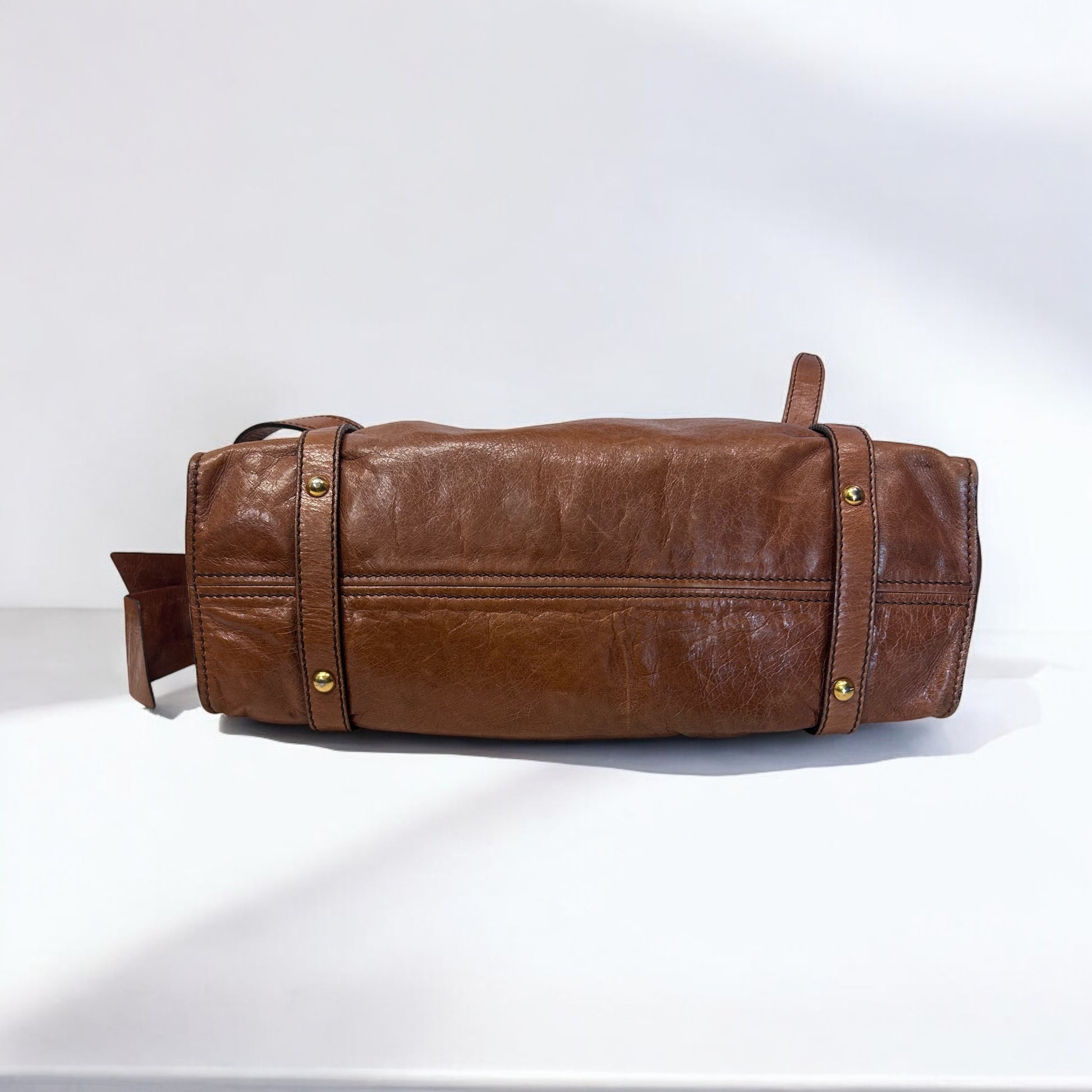התיק עשוי עור רך בצבע חום קרמל עם חומרה בזהב ופפיון מקסים בצד התיק