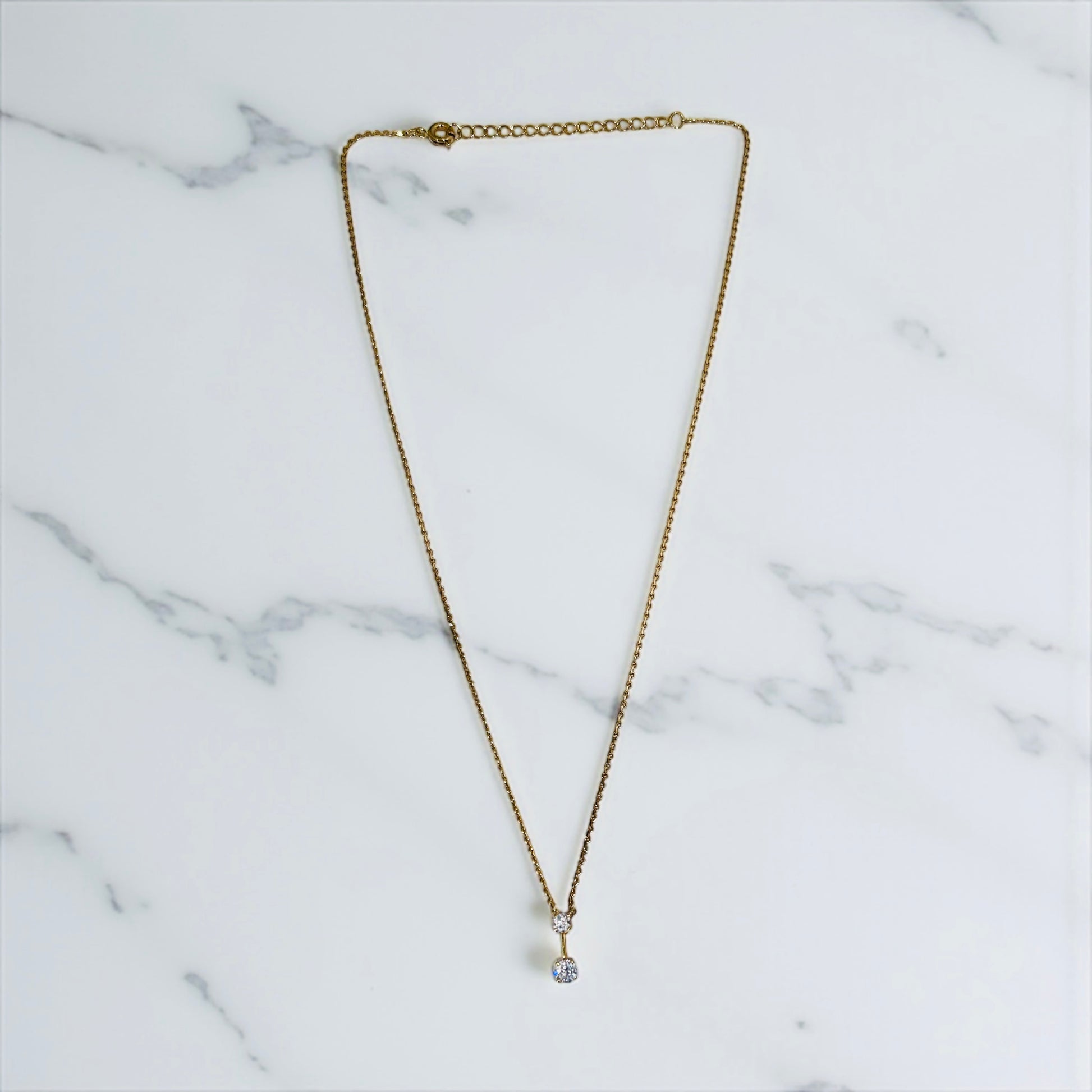 שרשרת וינטג׳ עדינה ואלגנטית עשויה ציפוי זהב , עם תליון מינימליסטי בעל שני קריסטלים בוהקים המחוברים בקו אנכי עדין.