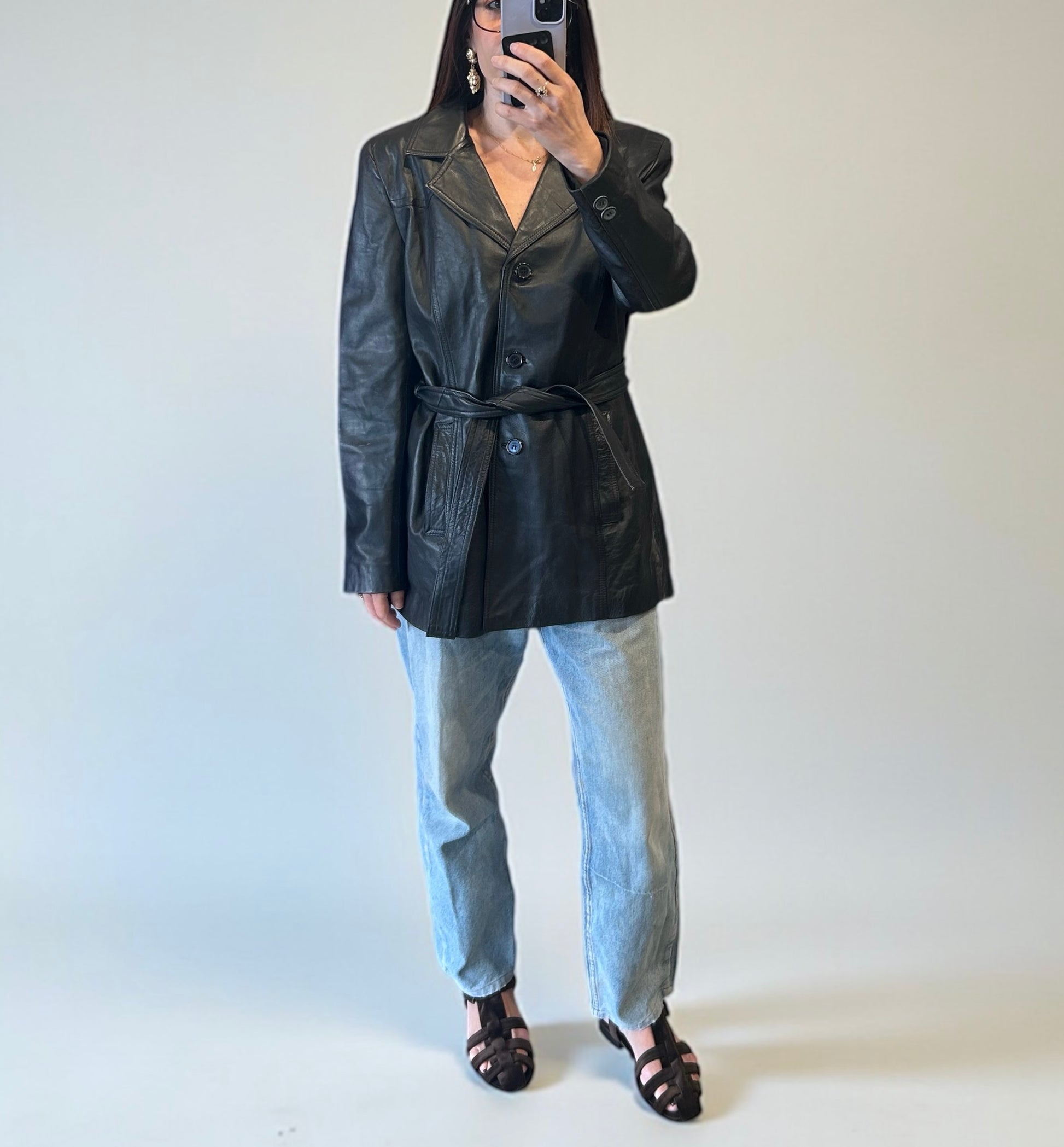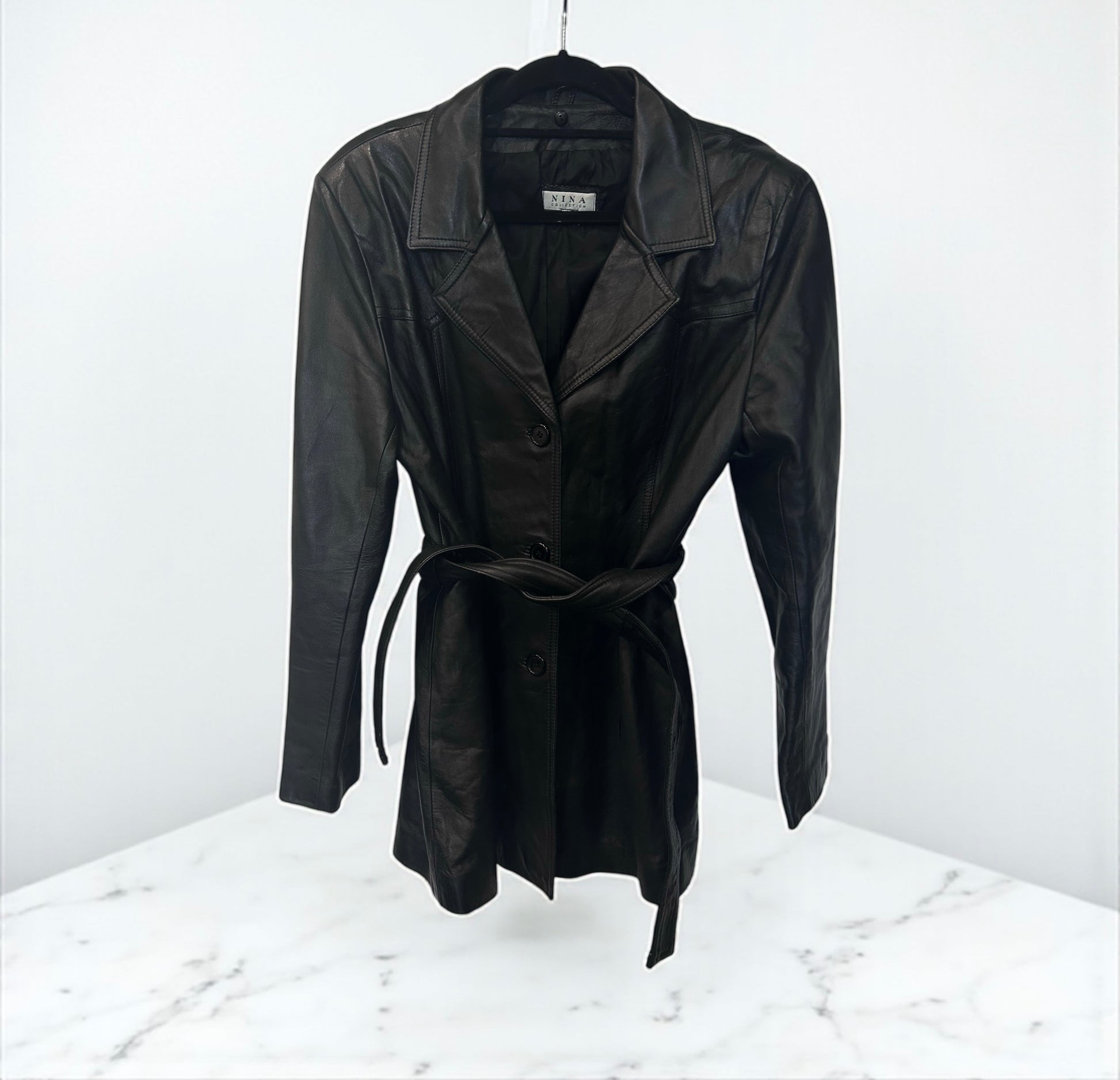עשוי עור שחור רך ואיכותי, בגזרה קלאסית עם דש מחודד וסגירה בכפתורים בחזית. מגיע עם חגורת קשירה תואמת להדגשת המותן