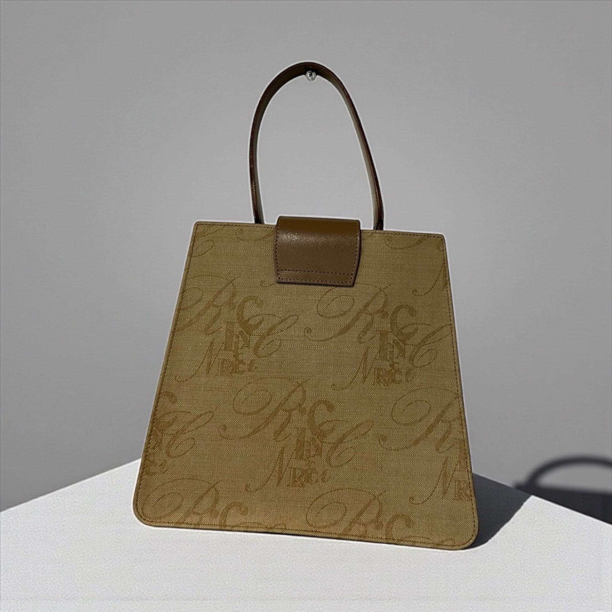 התיק עשוי ז׳קארד בצבע בז׳ כהה בהדפס המזוהה עם המותג בשילוב עור חום ואבזם יפיפה בצבע זהב .